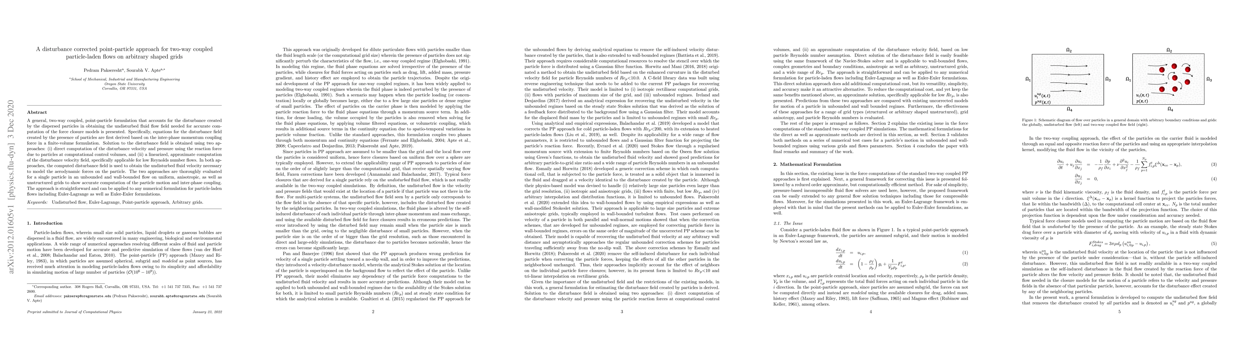 This paper presents a point-particle approach for two-way coupled particle-laden flows, accounting for particle-induced disturbances to compute accurate fluid flow fields. It evaluates two methods for disturbance computation, demonstrating accurate particle motion modeling on various grid types.