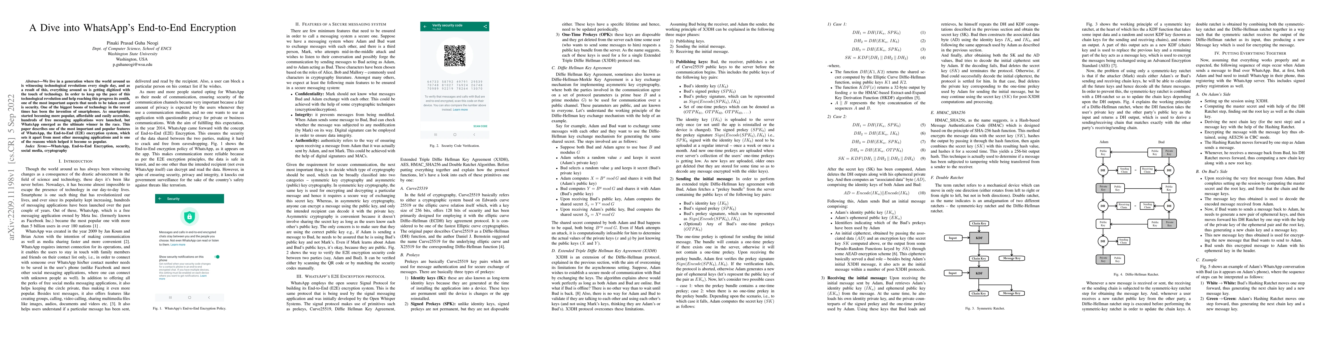 We live in a generation where the world around us is witnessing technological revolutions every single day, and as a result of this, everything around us is getting digitized with the touch of technology. In order to keep up the pace of this technological revolution and help reaching this progress its zenith, one of the most important aspects that needs to be taken care of is security. One of the biggest boons of technology in the recent times has been the invention of smartphones. As smartphones started becoming more popular, affordable and easily accessible, hundreds of free messaging applications were launched, but WhatsApp emerged as the ultimate winner in the race. This paper describes one of the most important and popular features of WhatsApp, the End-to-End (E2E) encryption system, which sets it apart from most other messaging applications and is one of the reasons which helped it become so popular.