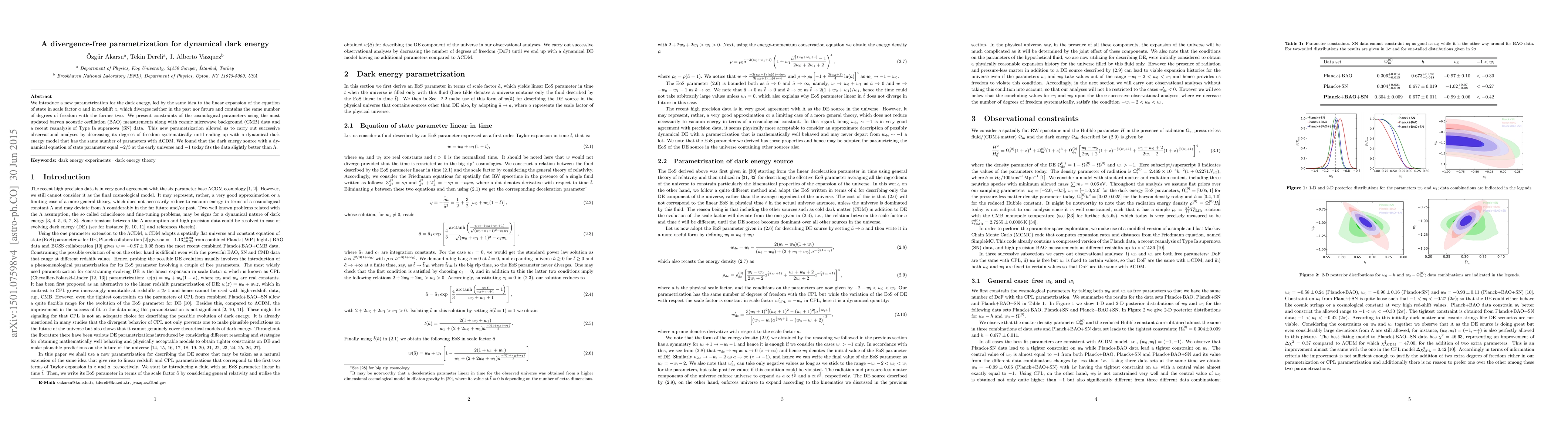 We introduce a new parametrization for the dark energy, led by the same idea to the linear expansion of the equation of state in scale factor $a$ and in redshift $z$, which diverges neither in the past nor future and contains the same number of degrees of freedom with the former two. We present constraints of the cosmological parameters using the most updated baryon acoustic oscillation (BAO) measurements along with cosmic microwave background (CMB) data and a recent reanalysis of Type Ia supernova (SN) data. This new parametrization allowed us to carry out successive observational analyses by decreasing its degrees of freedom systematically until ending up with a dynamical dark energy model that has the same number of parameters with $\Lambda$CDM. We found that the dark energy source with a dynamical equation of state parameter equal $-2/3$ at the early universe and $-1$ today fits the data slightly better than $\Lambda$.