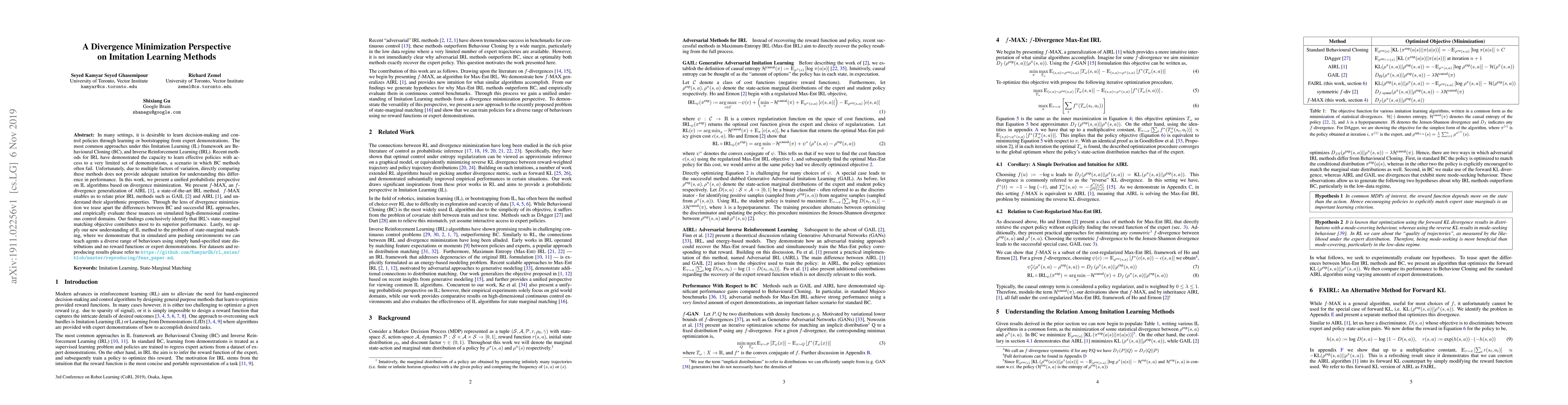 This paper presents a new perspective on Imitation Learning methods through divergence minimization, which helps understand why some methods perform better than others. It also applies this understanding to teach agents diverse behaviors in simulated environments without expert demonstrations or rewards.