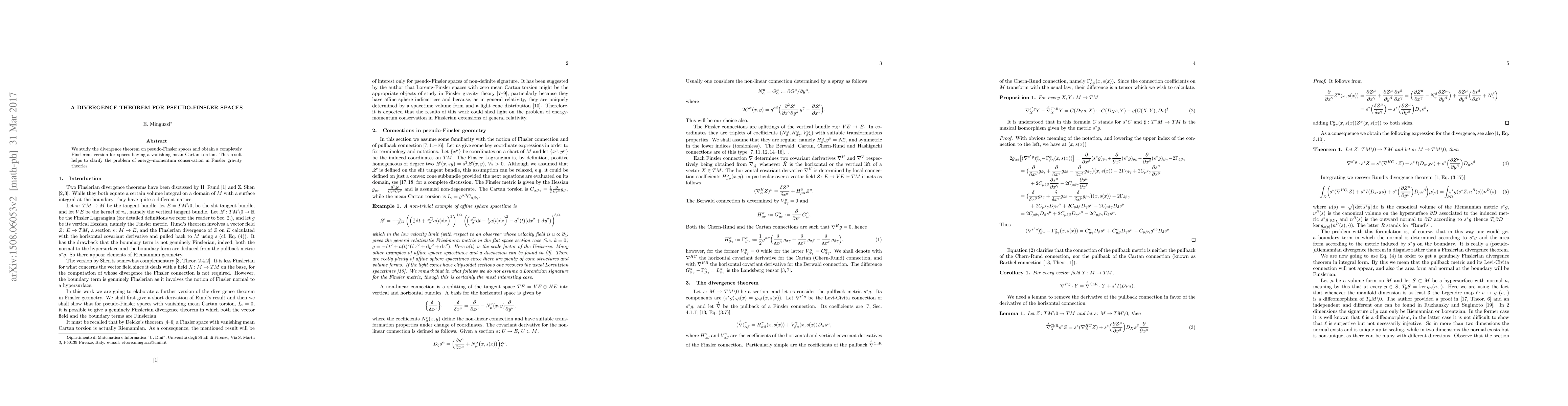 Summary: This paper establishes a divergence theorem for pseudo-Finsler spaces with vanishing mean Cartan torsion, providing insights into energy-momentum conservation in Finsler gravity theories. The result is purely Finslerian and enhances understanding of geometric structures in these spaces.