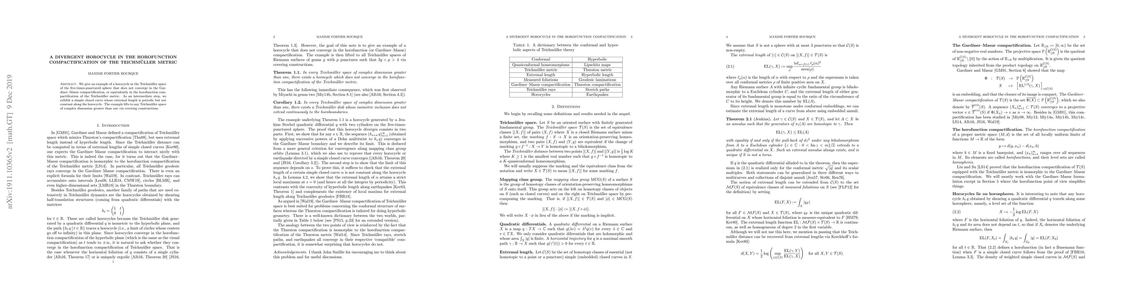 This paper presents a horocycle in the Teichmüller space of a five-times-punctured sphere that diverges in the Gardiner-Masur compactification, demonstrating a non-convergent behavior in the horofunction compactification. The study also reveals a periodic but non-constant extremal length for a simple closed curve along this horocycle.