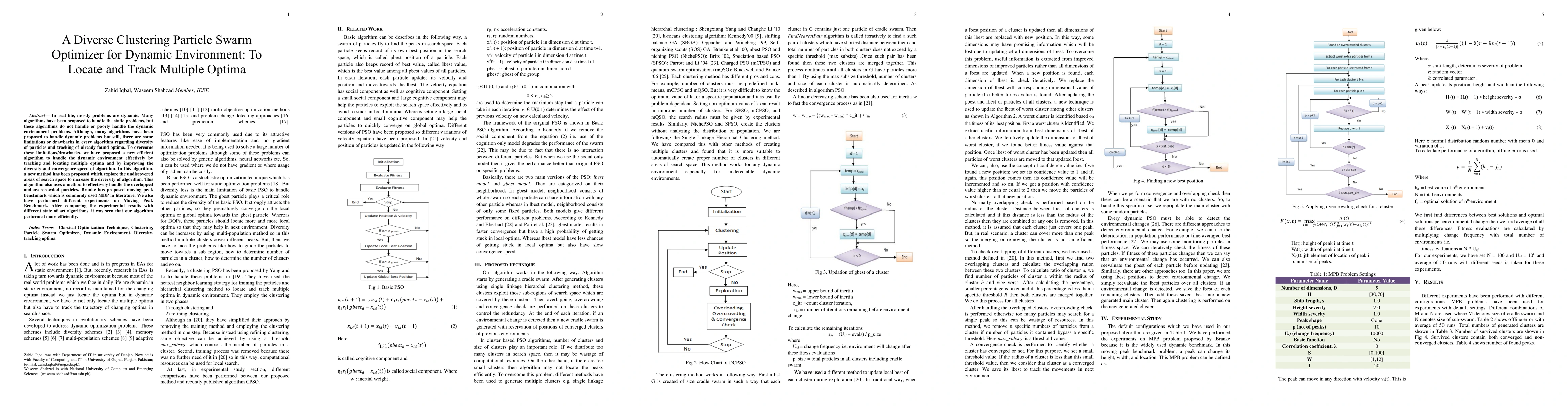 This paper proposes a Diverse Clustering Particle Swarm Optimizer (DCPSO) to effectively locate and track multiple optima in dynamic environments. The algorithm enhances particle diversity and convergence speed, and outperforms existing methods on the Moving Peak Benchmark.