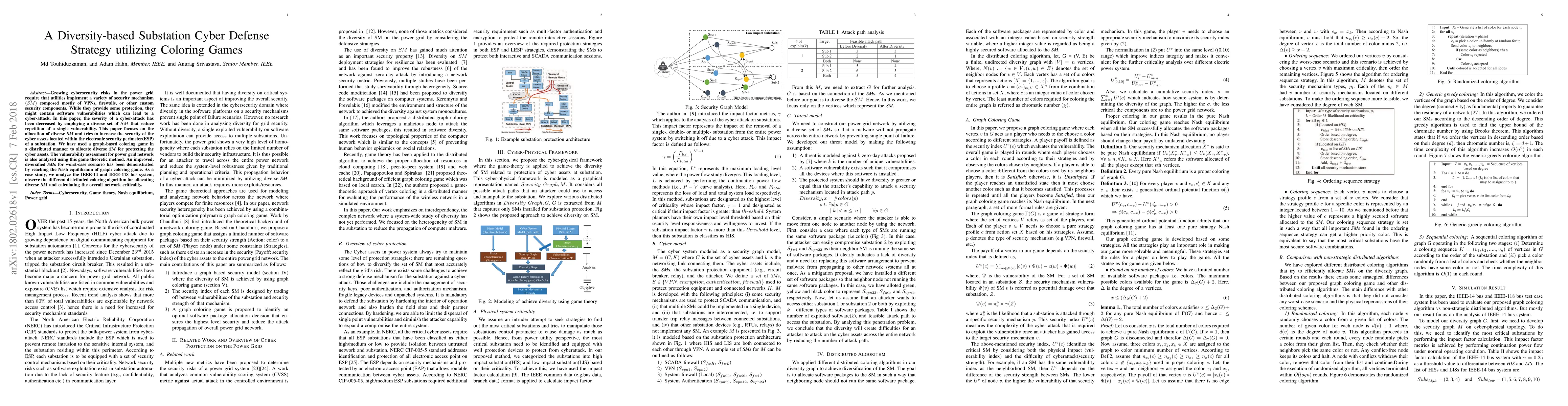 This paper proposes a diversity-based cyber defense strategy for substations using graph coloring games to allocate diverse security mechanisms. The approach aims to mitigate the risk of cyber-attacks by reducing vulnerability repetition and enhancing the security of cyber assets within the substation's electronic security perimeter.