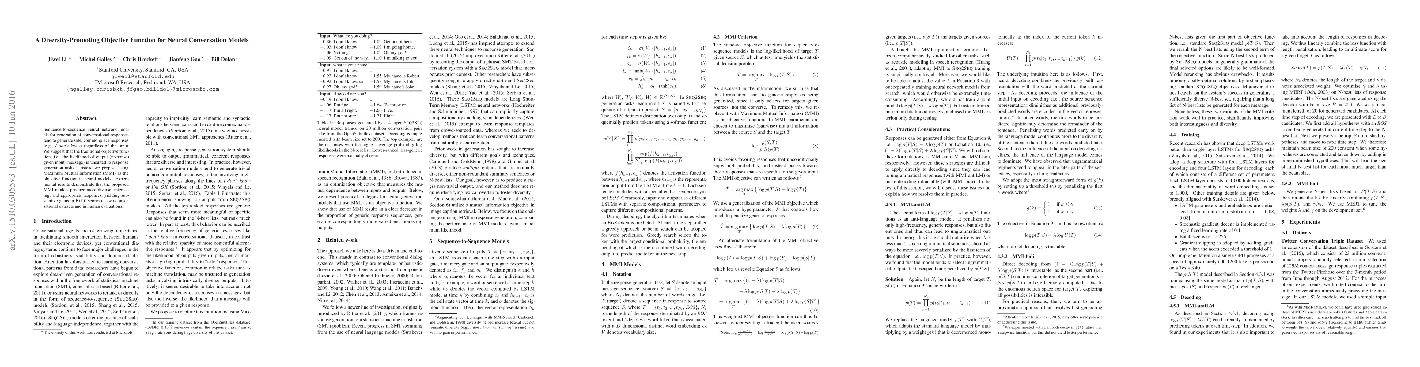 Sequence-to-sequence neural network models for generation of conversational responses tend to generate safe, commonplace responses (e.g., "I don't know") regardless of the input. We suggest that the traditional objective function, i.e., the likelihood of output (response) given input (message) is unsuited to response generation tasks. Instead we propose using Maximum Mutual Information (MMI) as the objective function in neural models. Experimental results demonstrate that the proposed MMI models produce more diverse, interesting, and appropriate responses, yielding substantive gains in BLEU scores on two conversational datasets and in human evaluations.