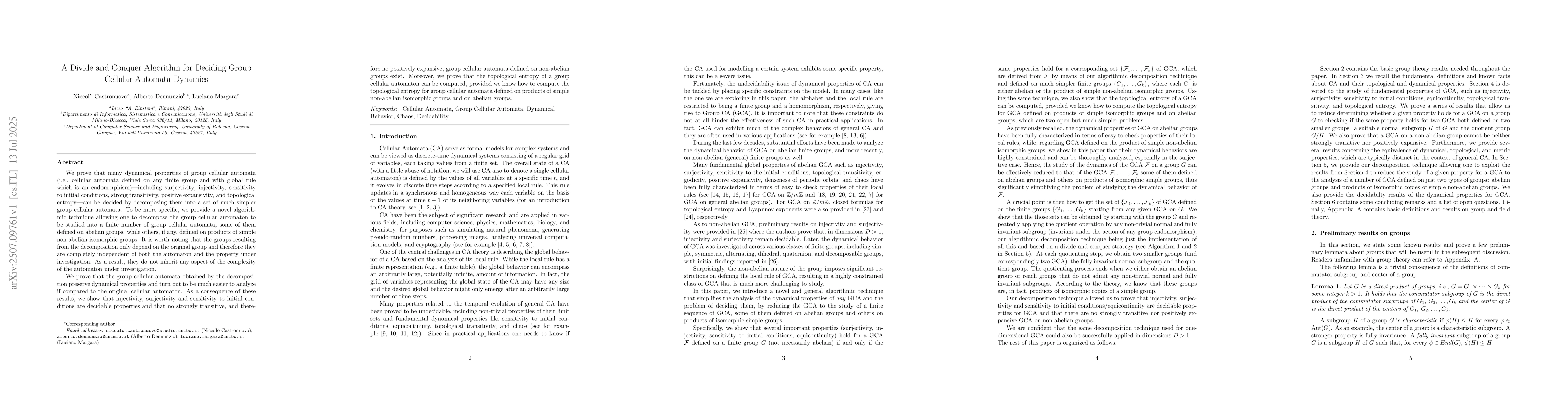 We prove that many dynamical properties of group cellular automata (i.e., cellular automata defined on any finite group and with global rule which is an endomorphism), including surjectivity, injectivity, sensitivity to initial conditions, strong transitivity, positive expansivity, and topological entropy, can be decided by decomposing them into a set of much simpler group cellular automata. To be more specific, we provide a novel algorithmic technique allowing one to decompose the group cellular automaton to be studied into a finite number of group cellular automata, some of them defined on abelian groups, while others, if any, defined on products of simple non-abelian isomorphic groups. It is worth noting that the groups resulting from the decomposition only depend on the original group and therefore they are completely independent of both the automaton and the property under investigation. As a result, they do not inherit any aspect of the complexity of the automaton under investigation. We prove that the group cellular automata obtained by the decomposition preserve dynamical properties and turn out to be much easier to analyze if compared to the original cellular automaton. As a consequence of these results, we show that injectivity, surjectivity and sensitivity to initial conditions are decidable properties and that no strongly transitive, and therefore no positively expansive, group cellular automata defined on non-abelian groups exist. Moreover, we prove that the topological entropy of a group cellular automaton can be computed, provided we know how to compute the topological entropy for group cellular automata defined on products of simple non-abelian isomorphic groups and on abelian groups.