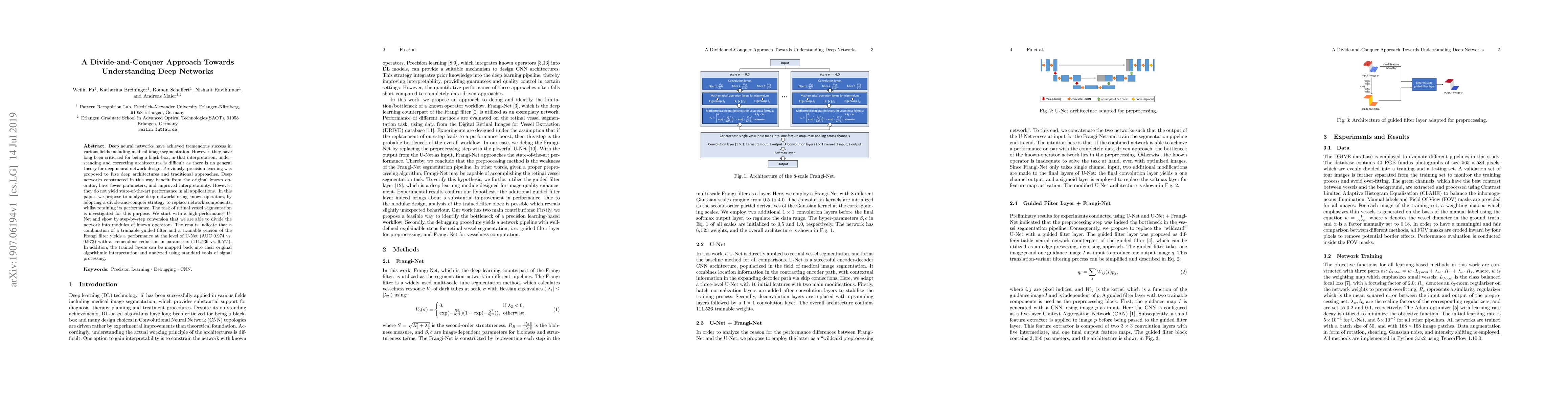 Deep neural networks have achieved tremendous success in various fields including medical image segmentation. However, they have long been criticized for being a black-box, in that interpretation, understanding and correcting architectures is difficult as there is no general theory for deep neural network design. Previously, precision learning was proposed to fuse deep architectures and traditional approaches. Deep networks constructed in this way benefit from the original known operator, have fewer parameters, and improved interpretability. However, they do not yield state-of-the-art performance in all applications. In this paper, we propose to analyze deep networks using known operators, by adopting a divide-and-conquer strategy to replace network components, whilst retaining its performance. The task of retinal vessel segmentation is investigated for this purpose. We start with a high-performance U-Net and show by step-by-step conversion that we are able to divide the network into modules of known operators. The results indicate that a combination of a trainable guided filter and a trainable version of the Frangi filter yields a performance at the level of U-Net (AUC 0.974 vs. 0.972) with a tremendous reduction in parameters (111,536 vs. 9,575). In addition, the trained layers can be mapped back into their original algorithmic interpretation and analyzed using standard tools of signal processing.