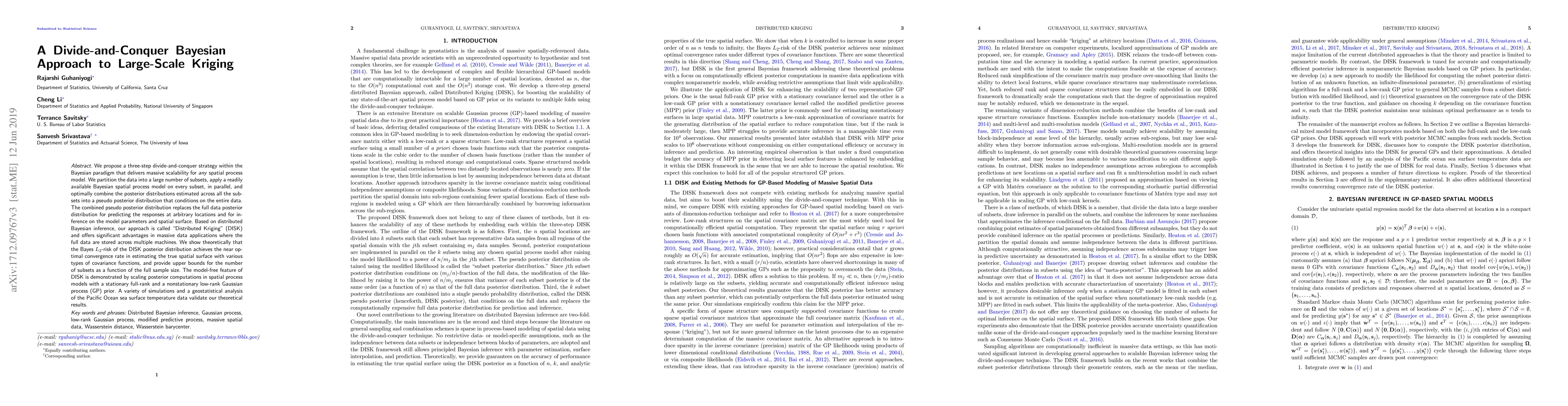 We propose a three-step divide-and-conquer strategy within the Bayesian paradigm that delivers massive scalability for any spatial process model. We partition the data into a large number of subsets, apply a readily available Bayesian spatial process model on every subset, in parallel, and optimally combine the posterior distributions estimated across all the subsets into a pseudo-posterior distribution that conditions on the entire data. The combined pseudo posterior distribution replaces the full data posterior distribution for predicting the responses at arbitrary locations and for inference on the model parameters and spatial surface. Based on distributed Bayesian inference, our approach is called "Distributed Kriging" (DISK) and offers significant advantages in massive data applications where the full data are stored across multiple machines. We show theoretically that the Bayes $L_2$-risk of the DISK posterior distribution achieves the near optimal convergence rate in estimating the true spatial surface with various types of covariance functions, and provide upper bounds for the number of subsets as a function of the full sample size. The model-free feature of DISK is demonstrated by scaling posterior computations in spatial process models with a stationary full-rank and a nonstationary low-rank Gaussian process (GP) prior. A variety of simulations and a geostatistical analysis of the Pacific Ocean sea surface temperature data validate our theoretical results.