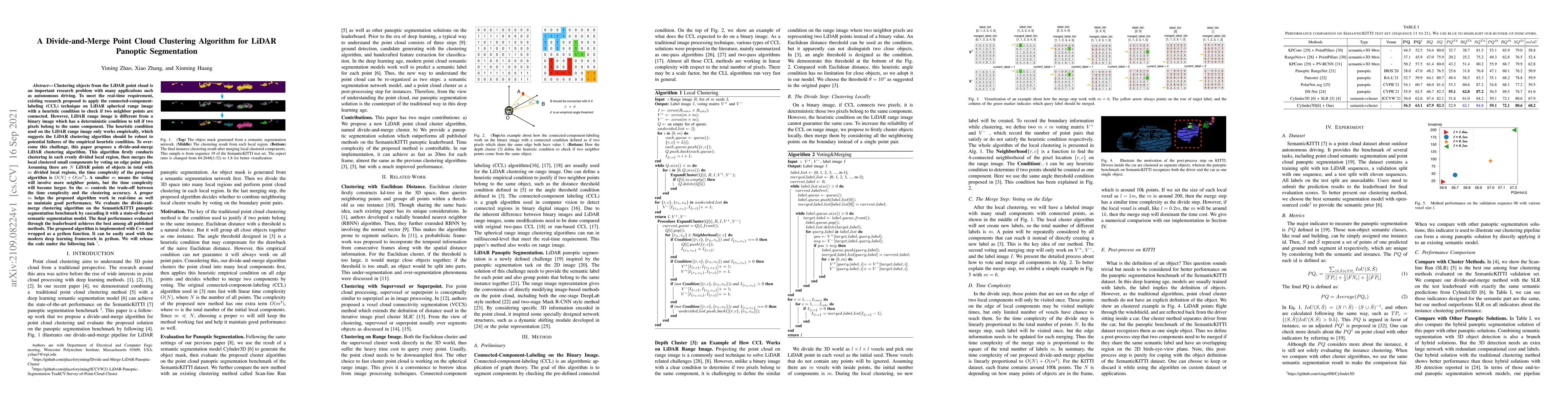 This paper proposes a divide-and-merge point cloud clustering algorithm for LiDAR panoptic segmentation, addressing the limitations of heuristic methods. The algorithm clusters local regions and merges clusters via edge point pair voting, achieving real-time performance with a balance between time complexity and accuracy.
