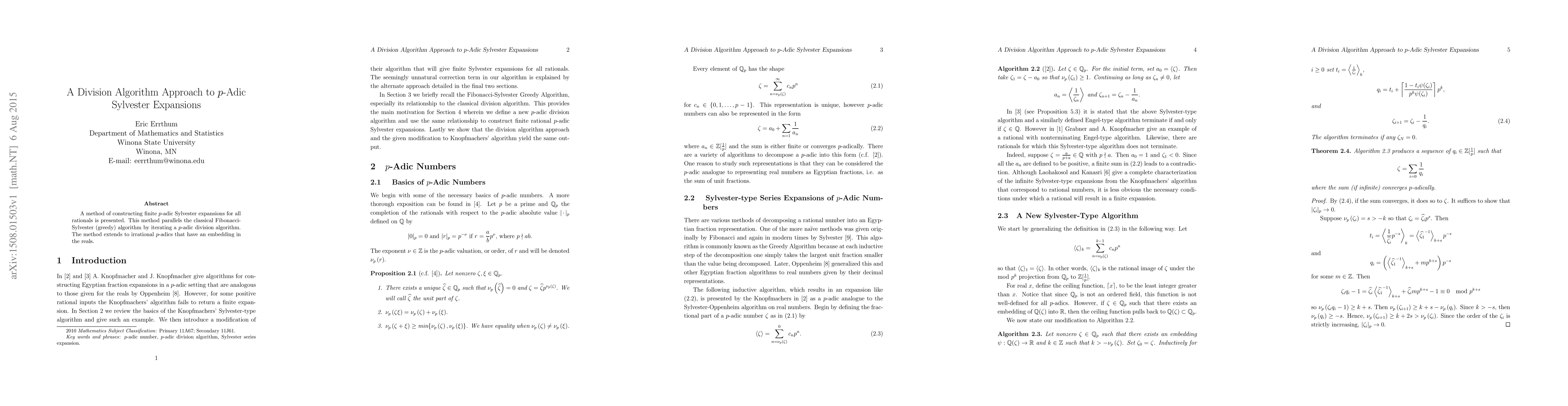 This paper introduces a $p$-adic division algorithm to construct finite $p$-adic Sylvester expansions for rationals, mirroring the classical Fibonacci-Sylvester algorithm, and extends the method to irrational $p$-adics with real embeddings.