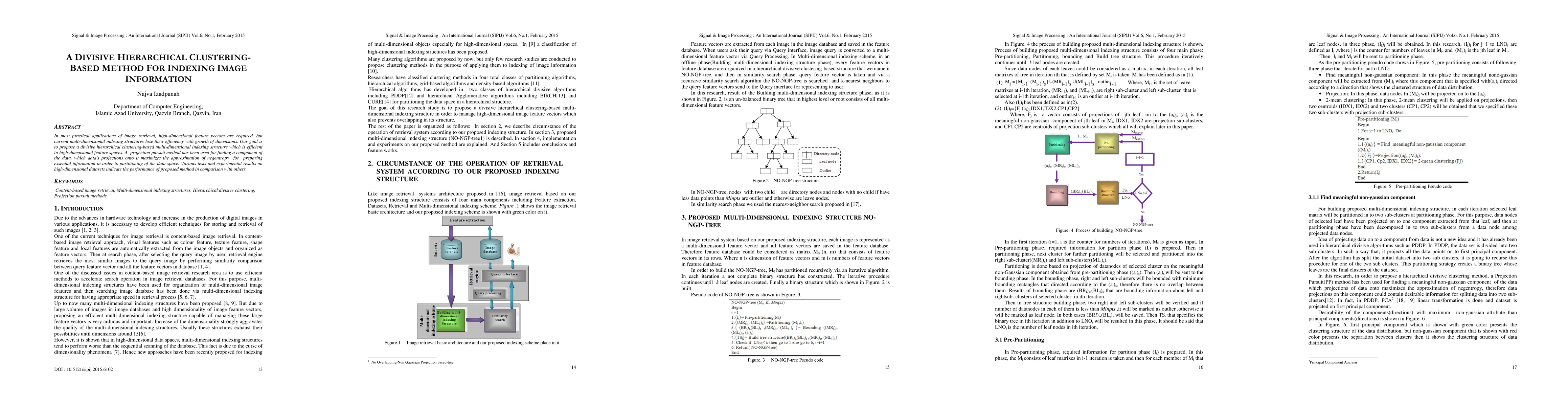 This paper proposes a divisive hierarchical clustering method for efficient indexing of high-dimensional image feature vectors, utilizing a projection pursuit technique to enhance data partitioning and improve retrieval performance over existing multi-dimensional indexing structures. Experimental results demonstrate the method's superior efficiency compared to alternative approaches.
