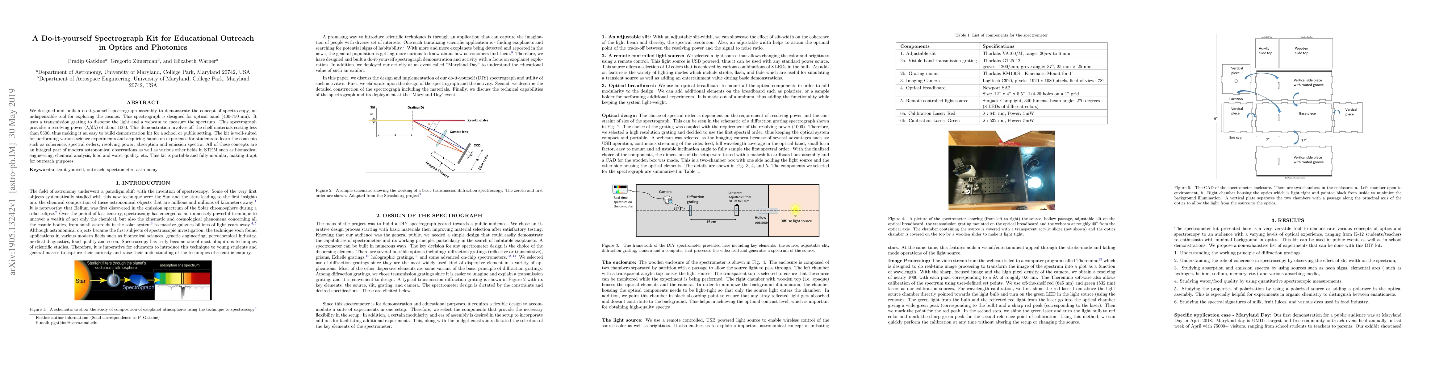 A DIY spectrograph kit has been created to teach students about spectroscopy using off-the-shelf materials for under $500. It provides a resolving power of 1000 and is portable and modular, making it suitable for educational outreach in optics and photonics.
