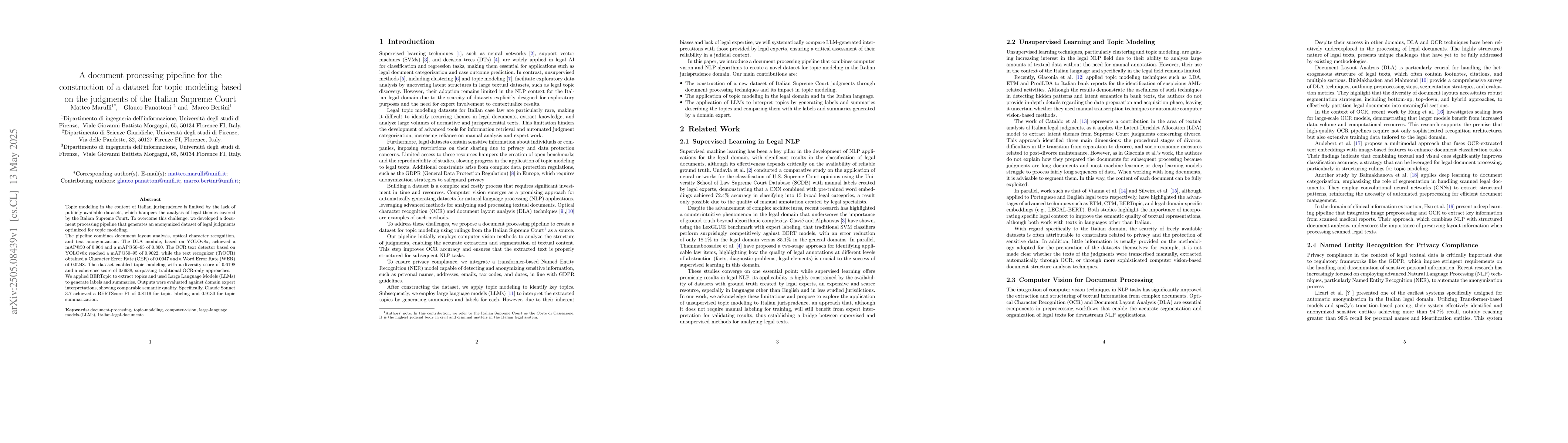A document processing pipeline was developed for constructing a dataset for topic modeling using Italian Supreme Court judgments. The pipeline includes document layout analysis (YOLOv8x), optical character recognition (OCR), and text anonymization.