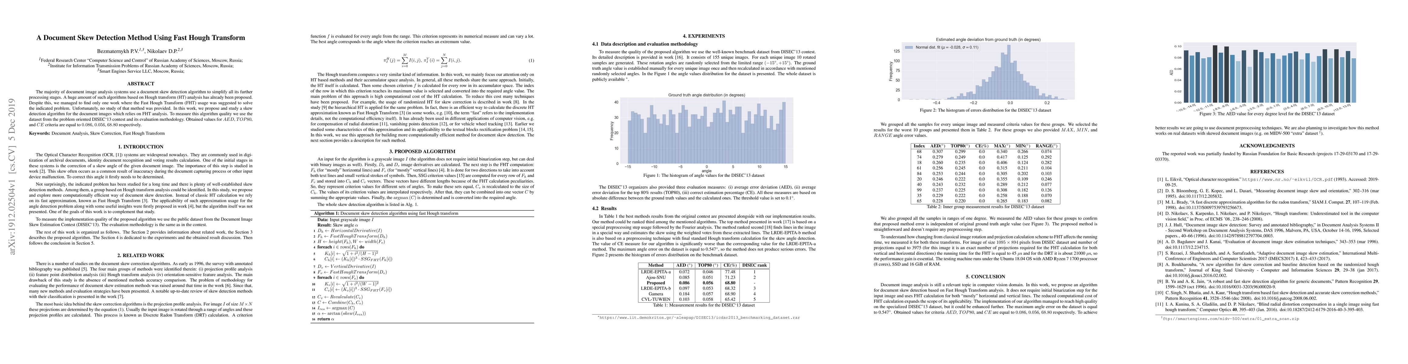 This paper proposes a document skew detection method using Fast Hough Transform (FHT) analysis, aiming to improve the efficiency of document image processing. The proposed FHT-based algorithm is evaluated using the DISEC'13 dataset, achieving notable results with AED, TOP80, and CE metrics of 0.086, 0.056, and 68.80 respectively.