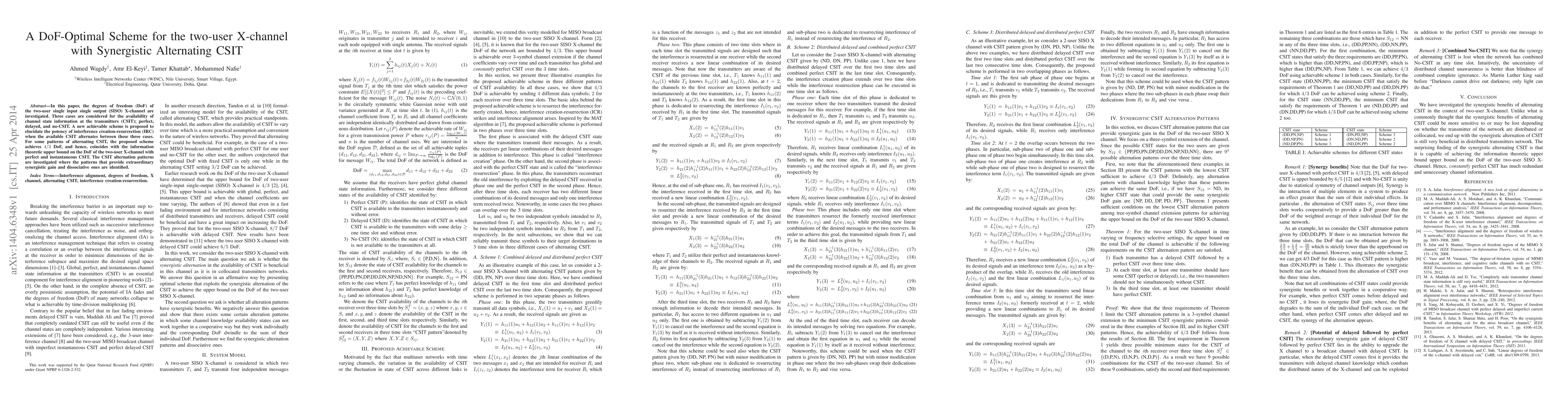 In this paper, the degrees of freedom (DoF) of the two-user single input single output (SISO) X-channel are investigated. Three cases are considered for the availability of channel state information at the transmitters (CSIT); perfect, delayed, and no-CSIT. A new achievable scheme is proposed to elucidate the potency of interference creation-resurrection (IRC) when the available CSIT alternates between these three cases. For some patterns of alternating CSIT, the proposed scheme achieves $4/3$ DoF, and hence, coincides with the information theoretic upper bound on the DoF of the two-user X-channel with perfect and instantaneous CSIT. The CSIT alternation patterns are investigated where the patterns that provide extraordinary synergistic gain and dissociative ones are identified.