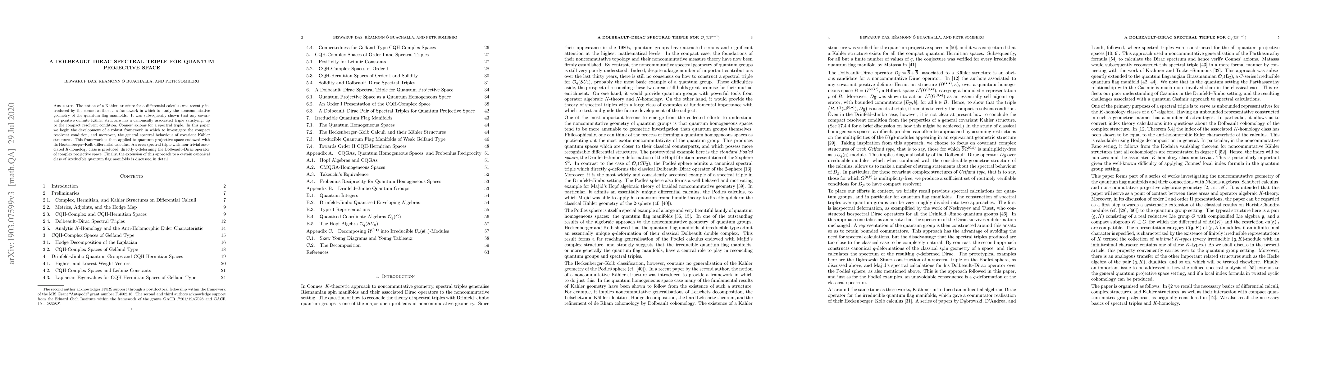 The notion of a K\"ahler structure for a differential calculus was recently introduced by the second author as a framework in which to study the noncommutative geometry of the quantum flag manifolds. It was subsequently shown that any covariant positive definite K\"ahler structure has a canonically associated triple satisfying, up to the compact resolvent condition, Connes' axioms for a spectral triple. In this paper we begin the development of a robust framework in which to investigate the compact resolvent condition, and moreover, the general spectral behaviour of covariant K\"ahler structures. This framework is then applied to quantum projective space endowed with its Heckenberger-Kolb differential calculus. An even spectral triple with non-trivial associated K-homology class is produced, directly q-deforming the Dirac-Dolbeault operator of complex projective space. Finally, the extension of this approach to a certain canonical larger class of compact quantum Hermitian symmetric spaces is discussed in detail.