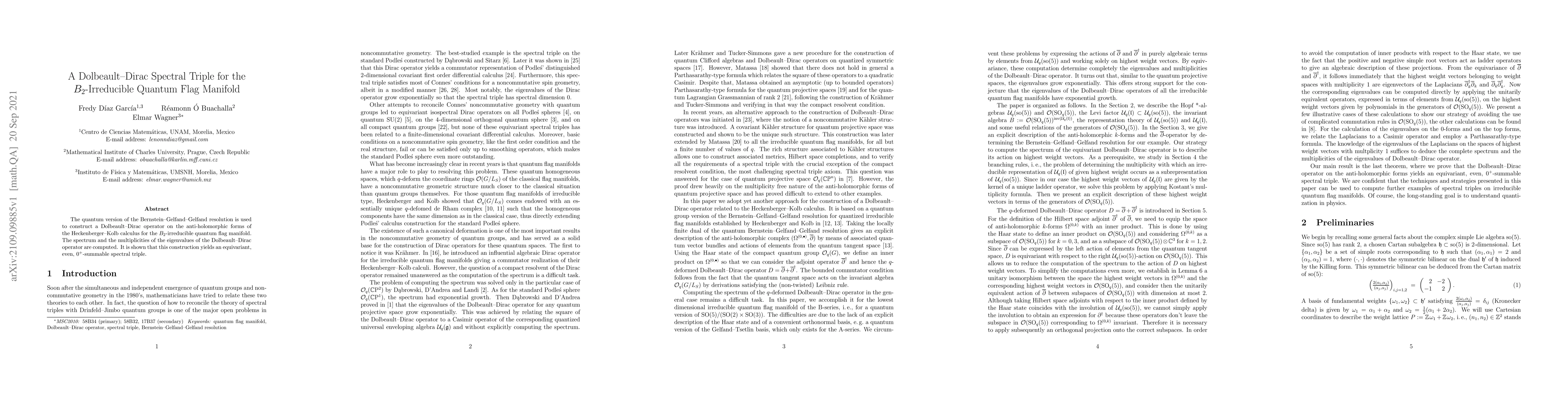 This paper constructs a Dolbeault-Dirac operator on the anti-holomorphic forms of the $B_2$-irreducible quantum flag manifold using the Bernstein-Gelfand-Gelfand resolution. It computes the spectrum and multiplicities of the operator, establishing an equivariant, even, $0^+$-summable spectral triple.