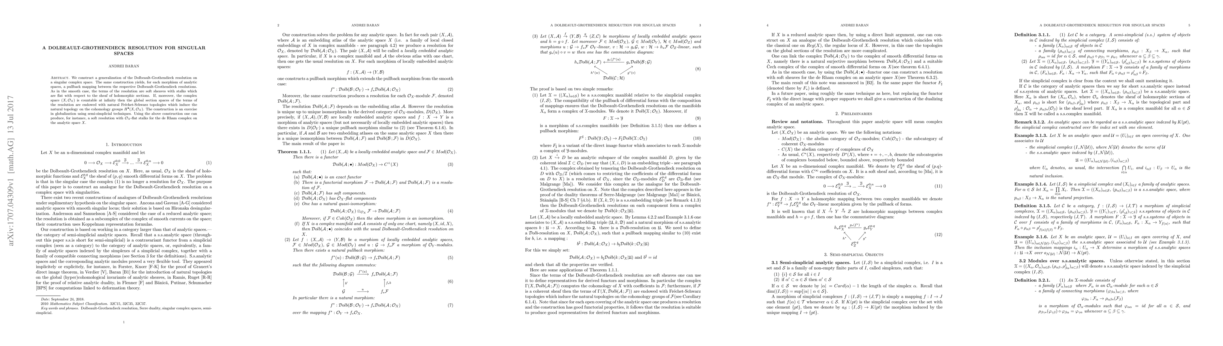We construct a generalization of the Dolbeault-Grothendieck resolution on a singular complex space. The same construction yields, for each morphism of analytic spaces, a pullback mapping between the respective Dolbeault-Grothendieck resolutions. As in the smooth case, the terms of the resolution are soft sheaves with stalks which are flat with respect to the sheaf of holomorphic sections. If, moreover, the complex space $(X,\mathcal{O}_{X})$ is countable at infinity then the global section spaces of the terms of the resolution are endowed with natural Fr\'{e}chet-Schwarz topologies which induce the natural topology on the cohomology groups $H^{\bullet }(X,\mathcal{O}_{X})$. The construction is an exercise in globalization using semi-simplicial techniques. Using the above construction one can produce, for instance, a soft resolution with $\mathcal{O}_{X}$-flat stalks for the de Rham complex on the analytic space $X$.