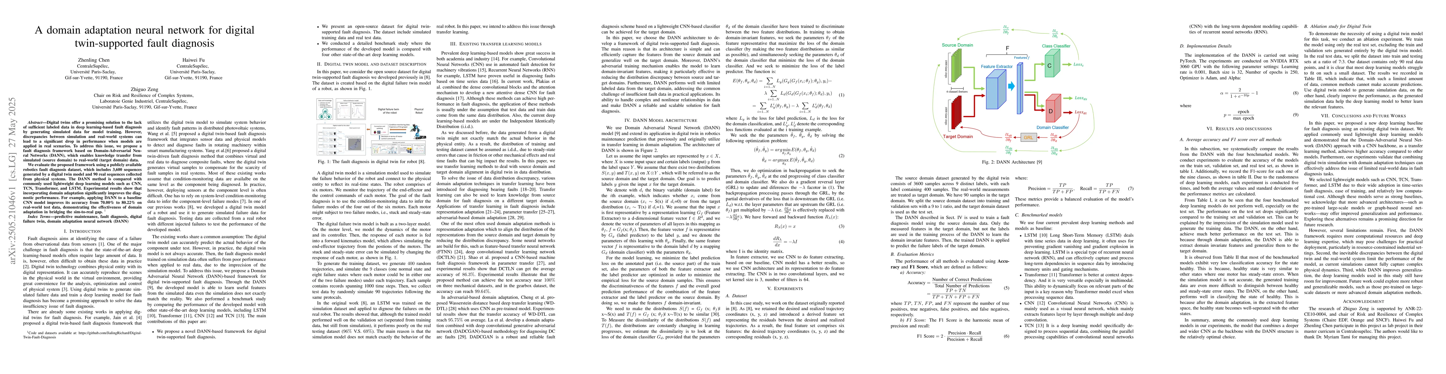 The novelty of this work lies in its application of domain adaptation techniques (DANN) specifically to digital twin-based fault diagnosis, demonstrating improved performance over conventional lightweight deep learning models.