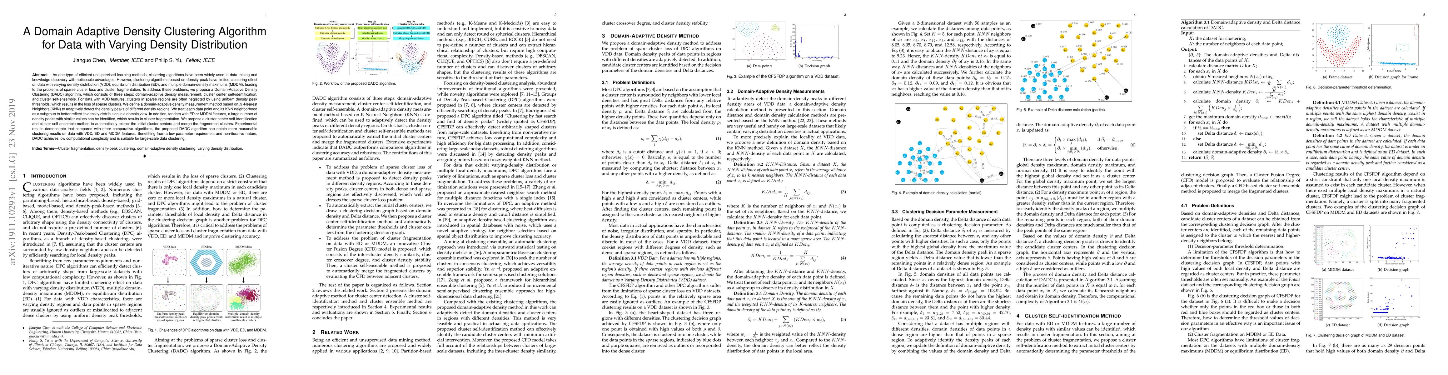 The paper proposes a Domain-Adaptive Density Clustering (DADC) algorithm to address clustering issues in data with varying density distribution, equilibrium distribution, and multiple domain-density maximums. The DADC algorithm adaptively measures density using KNN, identifies cluster centers, and merges fragmented clusters, achieving better clustering results with low computational complexity.