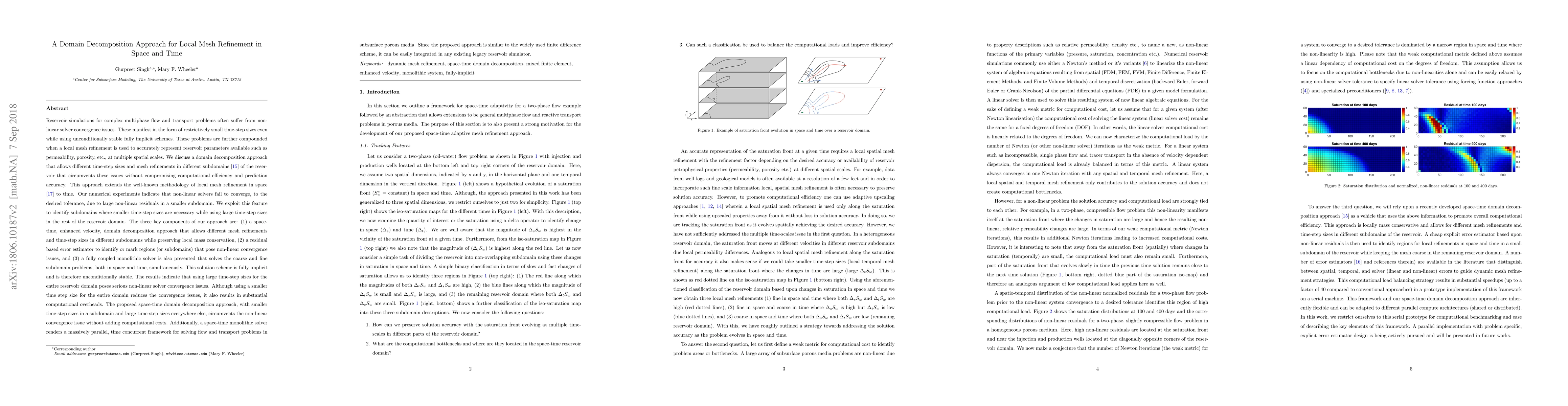 We present an adaptive space-time mesh refinement approach based a domain decomposition approach (Singh and Wheeler, 2018) that allows different time-step sizes and mesh refinements in different subdomains. Our numerical experiments indicate that non-linear solvers fail to converge, to the desired tolerance, due to large non-linear residuals in a smaller subdomain. We exploit this feature to identify subdomains where smaller time-step sizes are necessary while using large time-step sizes in the rest of the reservoir domain. The three key components of our approach are: (1) a space-time, enhanced velocity, domain decomposition approach that allows different mesh refinements and time-step sizes in different subdomains while preserving local mass conservation, (2) a residual based error estimator to identify or mark regions (or subdomains) that pose non-linear convergence issues, and (3) a fully coupled monolithic solver is also presented that solves the coarse and fine subdomain problems, both in space and time, simultaneously. This solution scheme is fully implicit and is therefore unconditionally stable. The proposed space-time domain decomposition approach, with smaller time-step sizes in a subdomain and large time-step sizes everywhere else, circumvents the non-linear convergence issue without adding computational costs. Additionally, a space-time monolithic solver renders a massively parallel, time concurrent framework for solving flow and transport problems in subsurface porous media. Since the proposed approach is similar to the widely used finite difference scheme, it can be easily integrated in any existing legacy reservoir simulator.