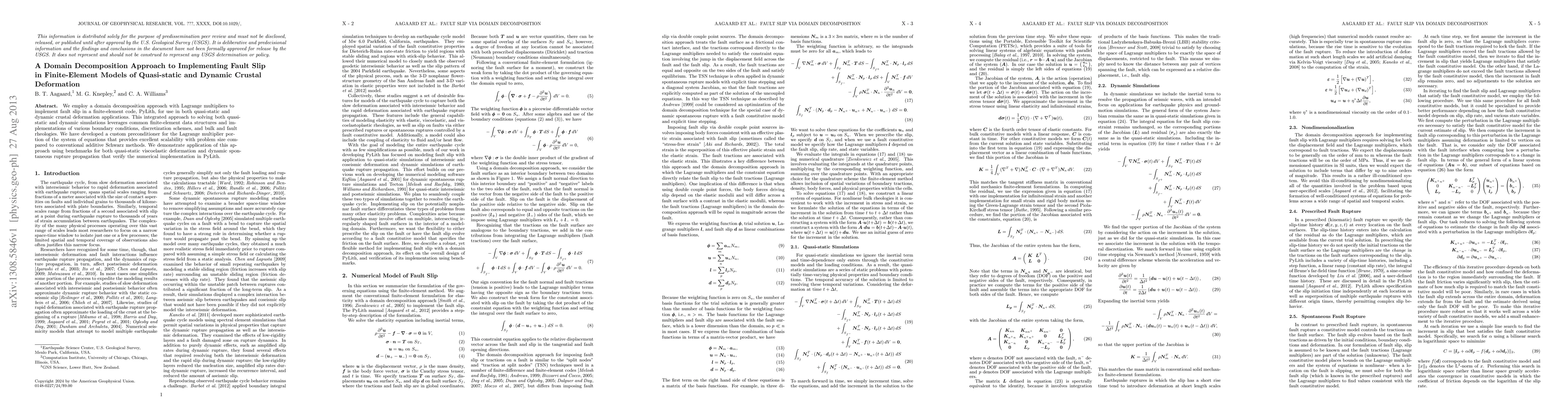 This paper presents a domain decomposition method using Lagrange multipliers to implement fault slip in PyLith's finite-element models for both quasi-static and dynamic crustal deformation. The approach demonstrates excellent scalability and is validated through benchmarks for viscoelastic and dynamic rupture simulations.