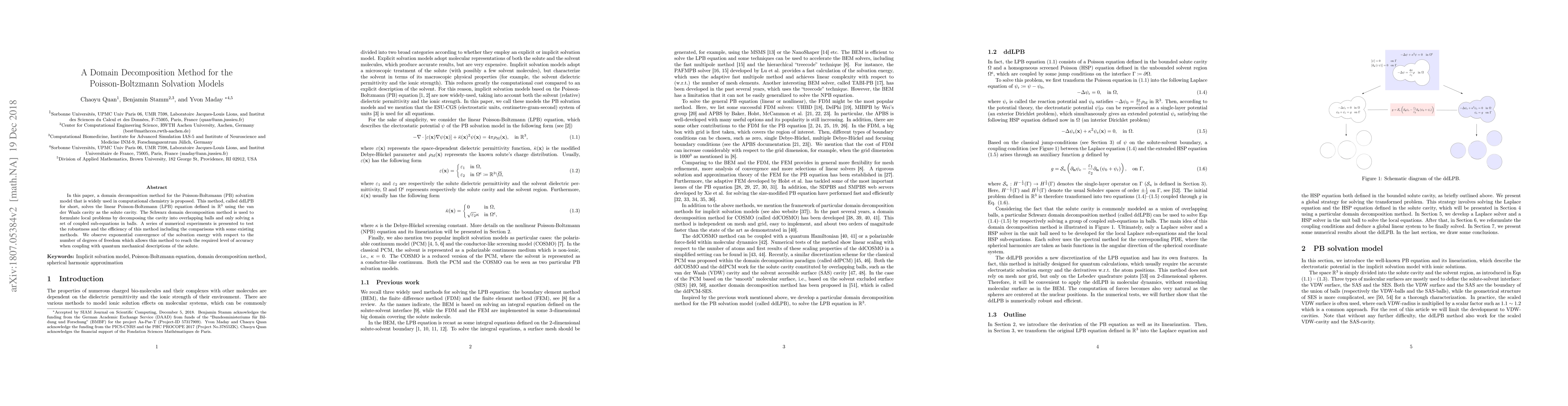 This paper proposes a domain decomposition method (ddLPB) for solving the linear Poisson-Boltzmann equation in computational chemistry, demonstrating exponential convergence and high efficiency through numerical experiments. The Schwarz method decomposes the solute cavity into overlapping balls to solve coupled sub-equations.