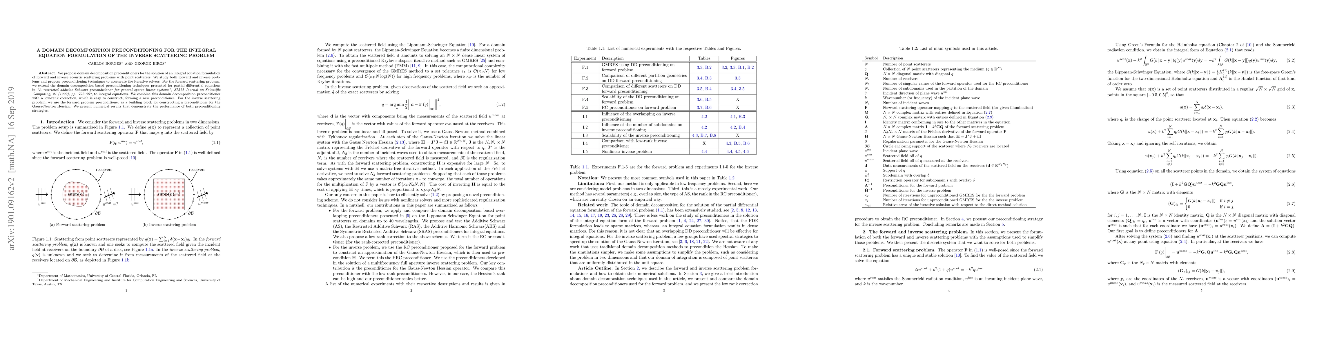 We propose domain decomposition preconditioners for the solution of an integral equation formulation of forward and inverse acoustic scattering problems with point scatterers. We study both forward and inverse problems and propose preconditioning techniques to accelerate the iterative solvers. For the forward scattering problem, we extend the domain decomposition based preconditioning techniques presented for partial differential equations in {\em "A restricted additive Schwarz preconditioner for general sparse linear systems", SIAM Journal on Scientific Computing, 21 (1999), pp. 792--797}, to integral equations. We combine this domain decomposition preconditioner with a low-rank correction, which is easy to construct, forming a new preconditioner. For the inverse scattering problem, we use the forward problem preconditioner as a building block for constructing a preconditioner for the Gauss-Newton Hessian. We present numerical results that demonstrate the performance of both preconditioning strategies.