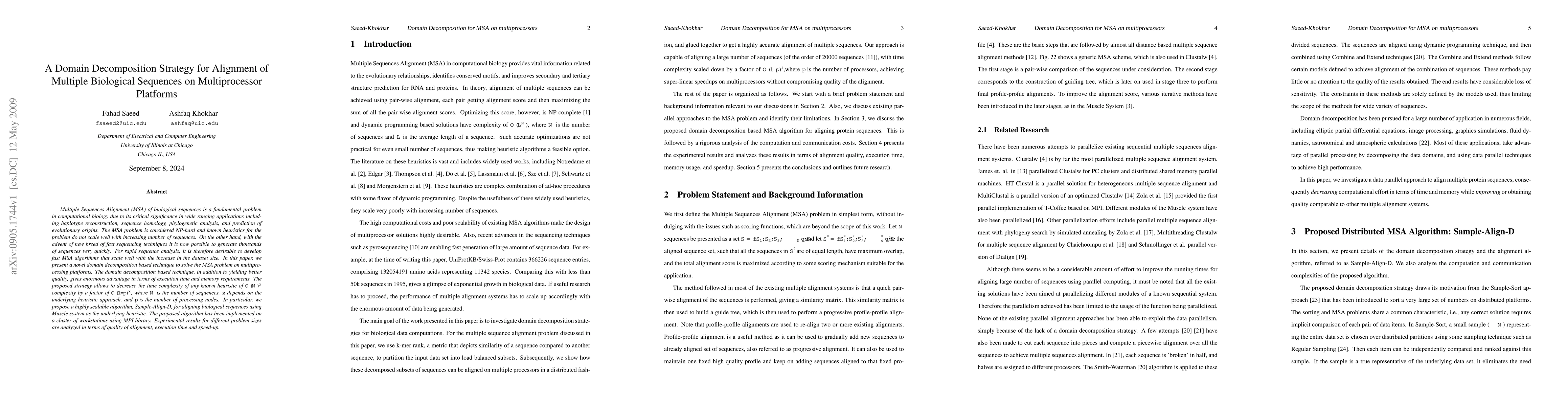 Multiple Sequences Alignment (MSA) of biological sequences is a fundamental problem in computational biology due to its critical significance in wide ranging applications including haplotype reconstruction, sequence homology, phylogenetic analysis, and prediction of evolutionary origins. The MSA problem is considered NP-hard and known heuristics for the problem do not scale well with increasing number of sequences. On the other hand, with the advent of new breed of fast sequencing techniques it is now possible to generate thousands of sequences very quickly. For rapid sequence analysis, it is therefore desirable to develop fast MSA algorithms that scale well with the increase in the dataset size. In this paper, we present a novel domain decomposition based technique to solve the MSA problem on multiprocessing platforms. The domain decomposition based technique, in addition to yielding better quality, gives enormous advantage in terms of execution time and memory requirements. The proposed strategy allows to decrease the time complexity of any known heuristic of O(N)^x complexity by a factor of O(1/p)^x, where N is the number of sequences, x depends on the underlying heuristic approach, and p is the number of processing nodes. In particular, we propose a highly scalable algorithm, Sample-Align-D, for aligning biological sequences using Muscle system as the underlying heuristic. The proposed algorithm has been implemented on a cluster of workstations using MPI library. Experimental results for different problem sizes are analyzed in terms of quality of alignment, execution time and speed-up.