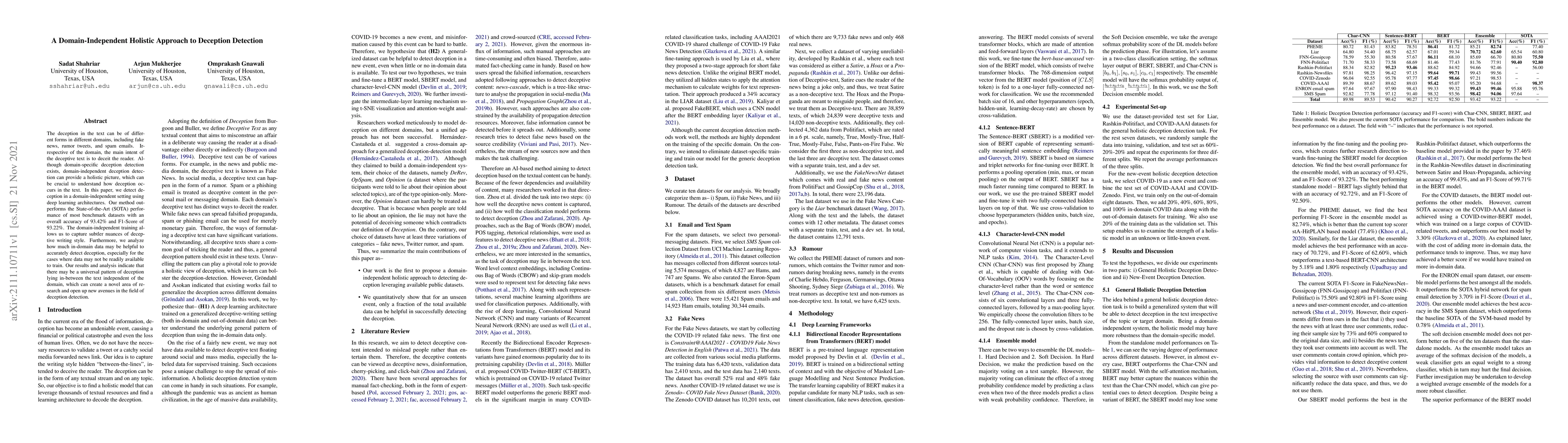 This paper proposes a domain-independent deep learning approach for detecting deception in text across various domains, achieving high accuracy and F1-Score. It suggests that a universal pattern of deception exists, independent of specific domains, which could lead to new research avenues in deception detection.