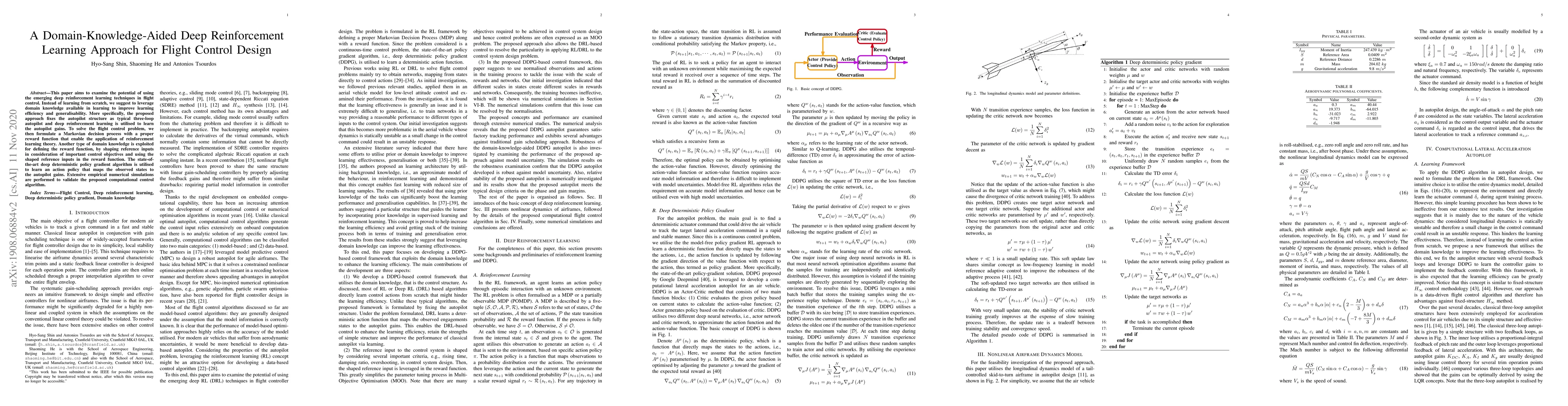 This paper proposes a domain-knowledge-aided deep reinforcement learning approach for flight control, leveraging domain knowledge to enhance learning efficiency and generalizability. The method fixes the autopilot structure and uses a deep deterministic policy gradient to optimize autopilot gains, with shaped reference inputs informing the reward function.