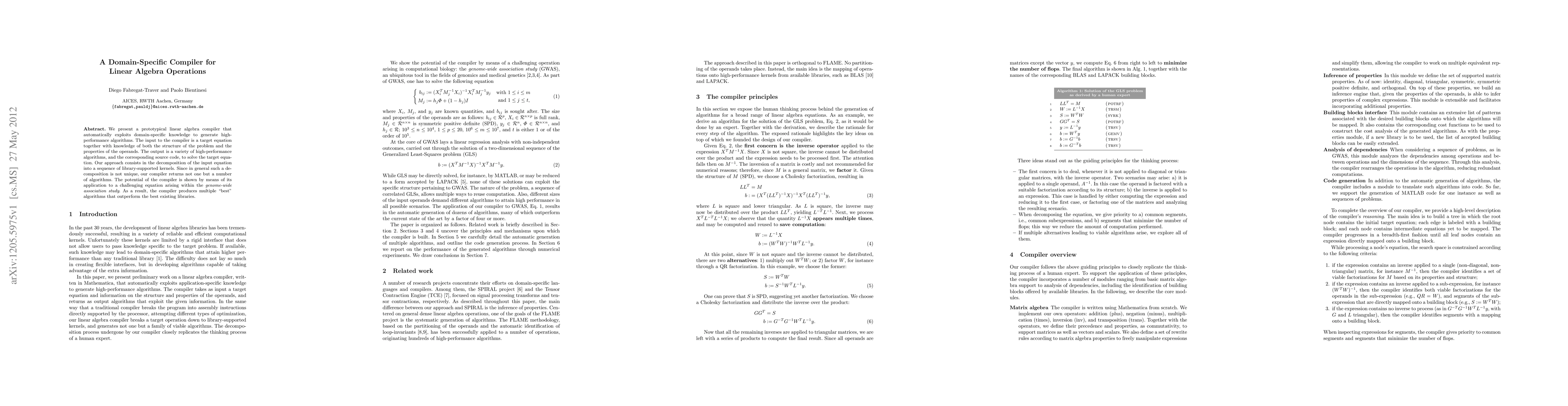This paper introduces a compiler specifically designed for linear algebra operations, which leverages domain knowledge to create high-performance algorithms. It decomposes input equations into library-supported kernels, generating multiple efficient solutions. The compiler's effectiveness is demonstrated by outperforming existing libraries in solving a complex genome-wide association study equation.