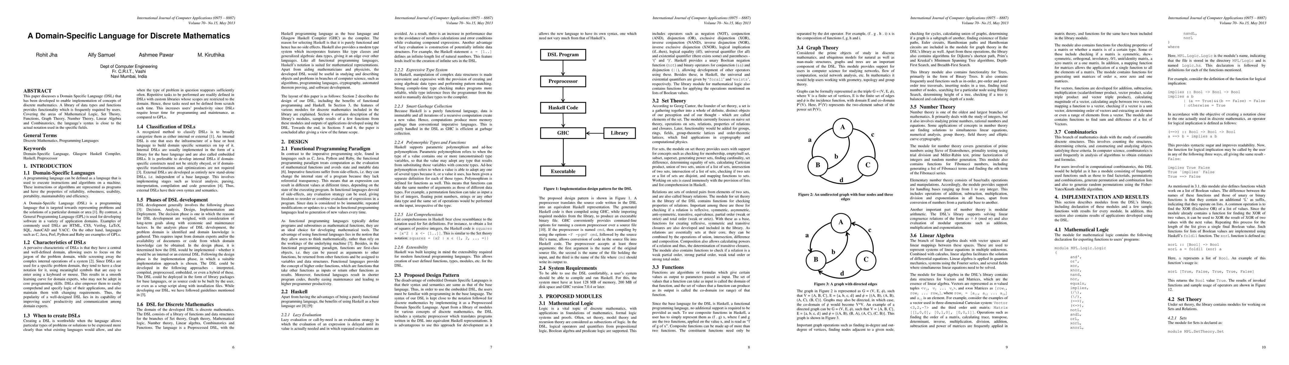 This paper introduces a Domain Specific Language (DSL) tailored for discrete mathematics, featuring a library for common mathematical constructs, with syntax mimicking notations from fields like Mathematical Logic, Set Theory, and Linear Algebra. The DSL aims to facilitate the implementation of discrete mathematics concepts.