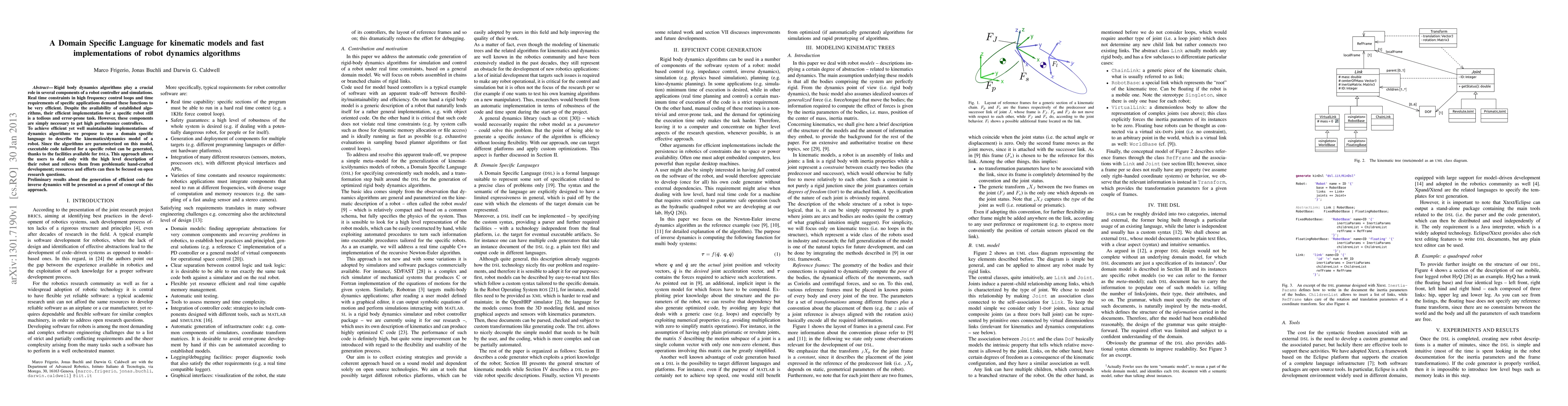 Rigid body dynamics algorithms play a crucial role in several components of a robot controller and simulations. Real time constraints in high frequency control loops and time requirements of specific applications demand these functions to be very efficient. Despite the availability of established algorithms, their efficient implementation for a specific robot still is a tedious and error-prone task. However, these components are simply necessary to get high performance controllers. To achieve efficient yet well maintainable implementations of dynamics algorithms we propose to use a domain specific language to describe the kinematics/dynamics model of a robot. Since the algorithms are parameterized on this model, executable code tailored for a specific robot can be generated, thanks to the facilities available for \dsls. This approach allows the users to deal only with the high level description of their robot and relieves them from problematic hand-crafted development; resources and efforts can then be focused on open research questions. Preliminary results about the generation of efficient code for inverse dynamics will be presented as a proof of concept of this approach.