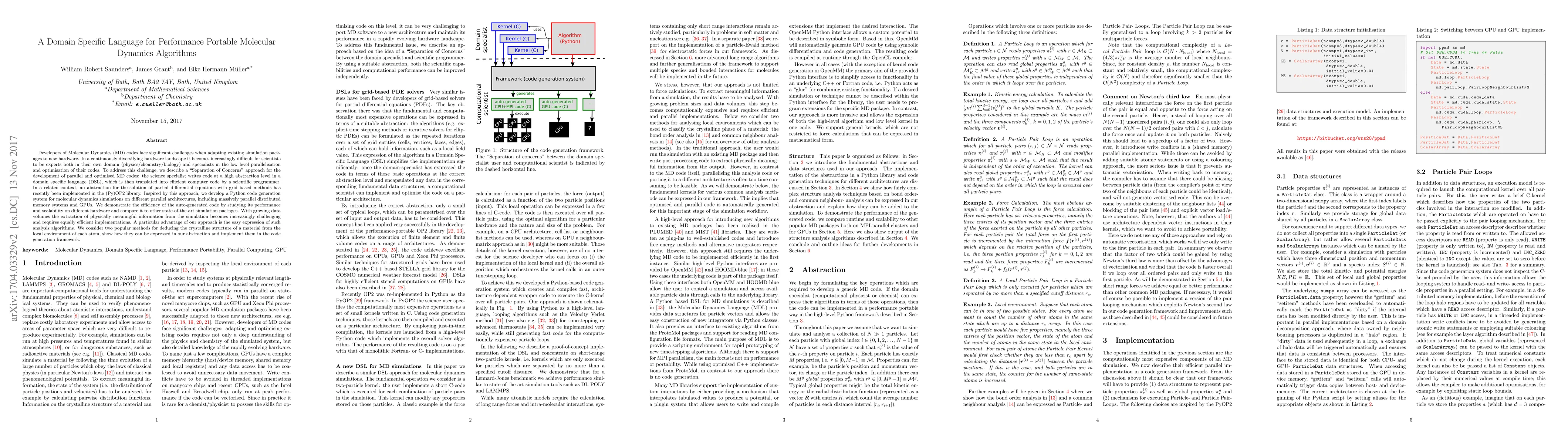 This paper introduces a domain-specific language for developing performance portable molecular dynamics algorithms, enabling science specialists to write high-level code that is translated into efficient parallel code for various hardware architectures. The approach demonstrates improved performance and scalability compared to existing methods.