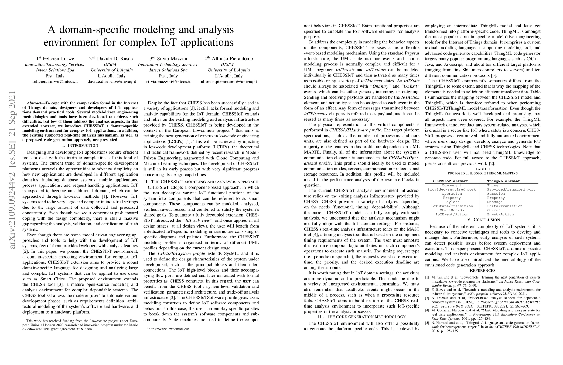 Summary: This paper introduces CHESSIoT, a domain-specific modeling environment for complex IoT applications, emphasizing its practical tools for analysis and a new code generation approach to address the challenges in IoT development.