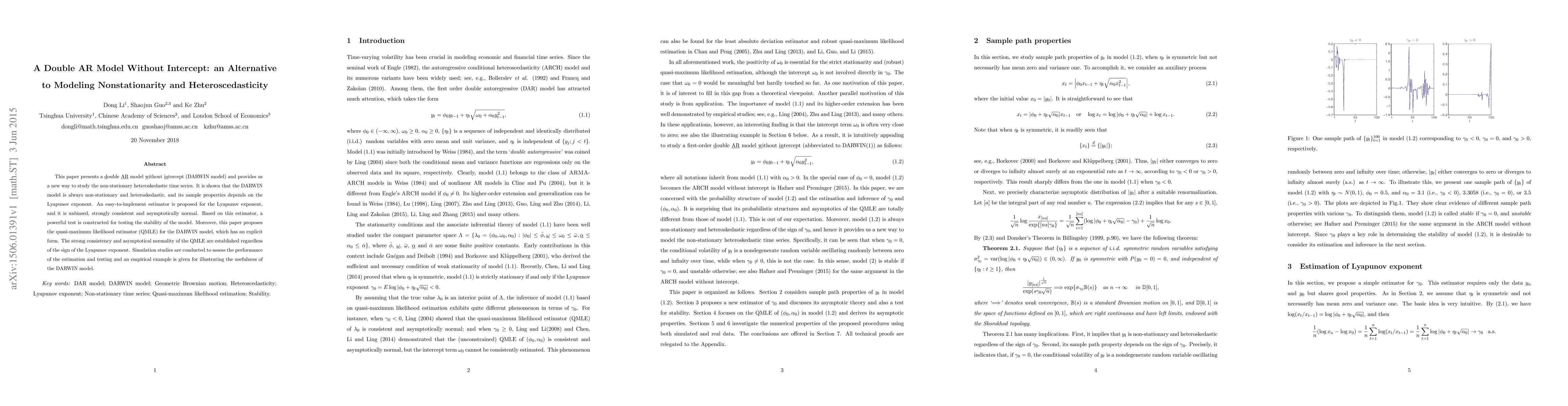 This paper presents a double AR model without intercept (DARWIN model) and provides us a new way to study the non-stationary heteroskedastic time series. It is shown that the DARWIN model is always non-stationary and heteroskedastic, and its sample properties depends on the Lyapunov exponent. An easy-to-implement estimator is proposed for the Lyapunov exponent, and it is unbiased, strongly consistent and asymptotically normal. Based on this estimator, a powerful test is constructed for testing the stability of the model. Moreover, this paper proposes the quasi-maximum likelihood estimator (QMLE) for the DARWIN model, which has an explicit form. The strong consistency and asymptotical normality of the QMLE are established regardless of the sign of the Lyapunov exponent. Simulation studies are conducted to assess the performance of the estimation and testing and an empirical example is given for illustrating the usefulness of the DARWIN model.