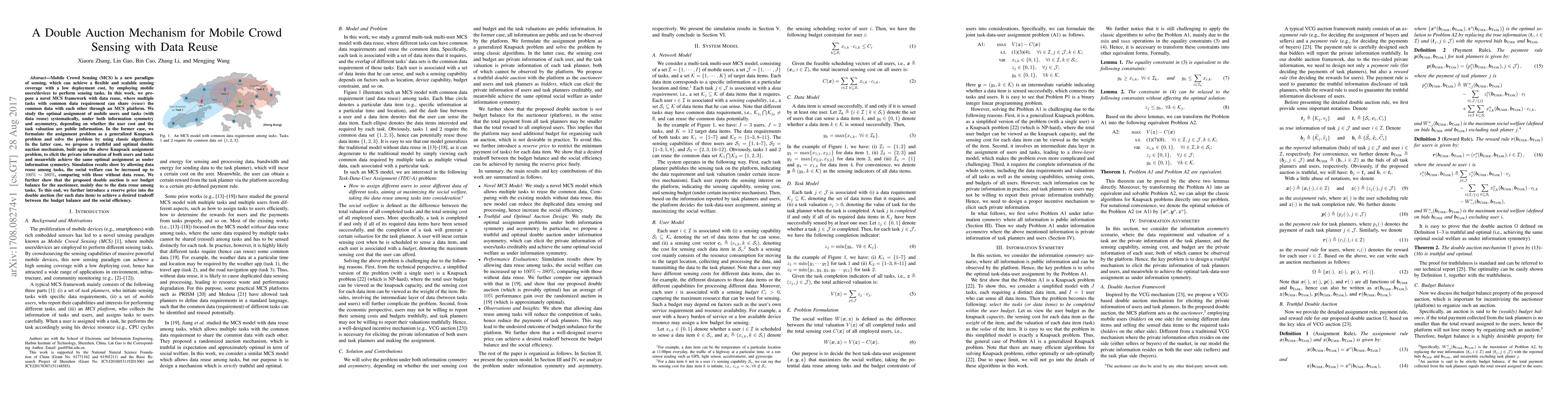 This paper proposes a novel Mobile Crowd Sensing framework that utilizes a double auction mechanism to optimize task assignments and data reuse among sensing tasks. The framework achieves optimal user-task assignment under both symmetric and asymmetric information conditions, significantly increasing social welfare by up to 380% through data reuse, while introducing a reserve price to balance budget constraints.