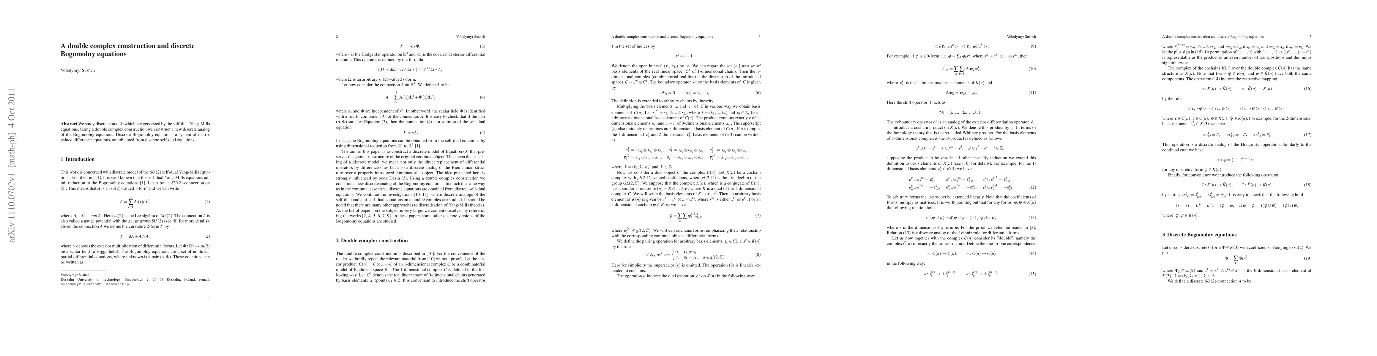 Summary: This paper constructs a new discrete analog of the Bogomolny equations using a double complex construction from self-dual Yang-Mills equations, resulting in a system of matrix-valued difference equations.