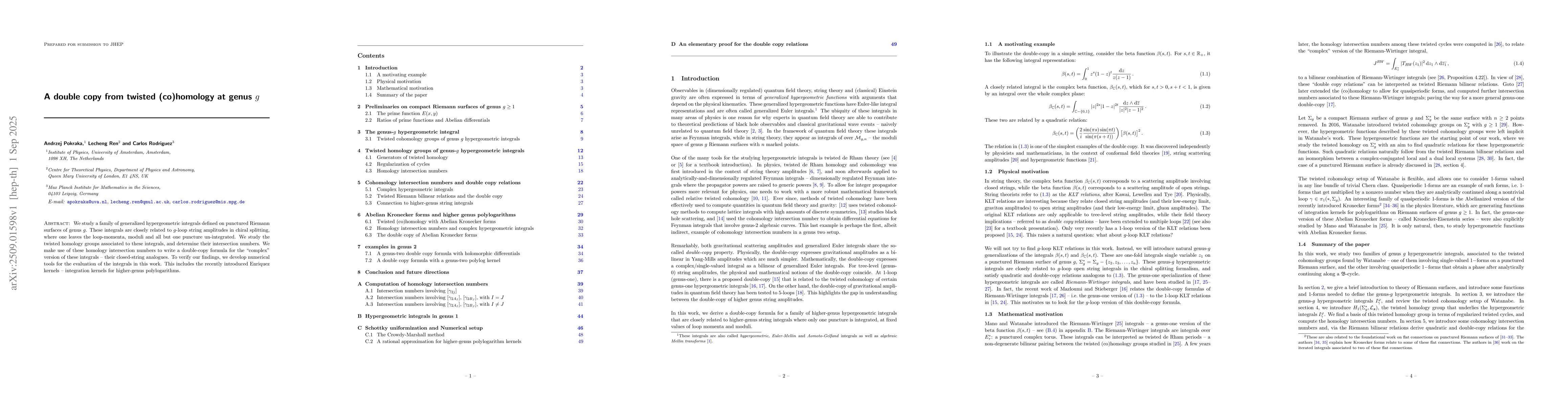 We study a family of generalized hypergeometric integrals defined on punctured Riemann surfaces of genus g. These integrals are closely related to g-loop string amplitudes in chiral splitting, where one leaves the loop-momenta, moduli and all but one puncture un-integrated. We study the twisted homology groups associated to these integrals, and determine their intersection numbers. We make use of these homology intersection numbers to write a double-copy formula for the "complex" version of these integrals -- their closed-string analogues. To verify our findings, we develop numerical tools for the evaluation of the integrals in this work. This includes the recently introduced Enriquez kernels -- integration kernels for higher-genus polylogarithms.