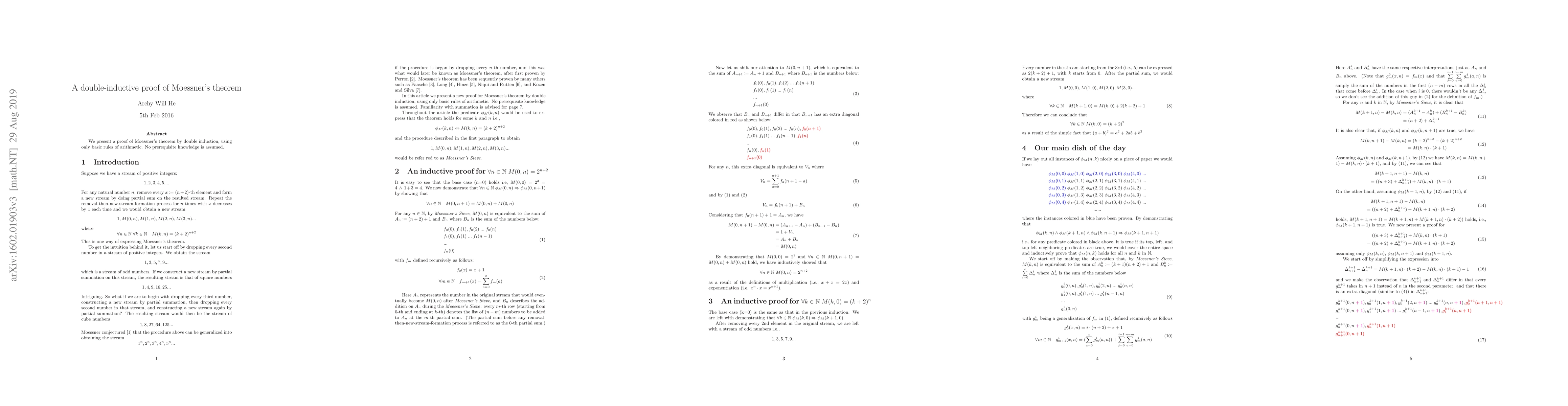 Summary: This paper provides a double-inductive proof of Moessner's theorem, relying solely on basic arithmetic rules and elementary summation concepts, making it accessible to readers without advanced mathematical background.