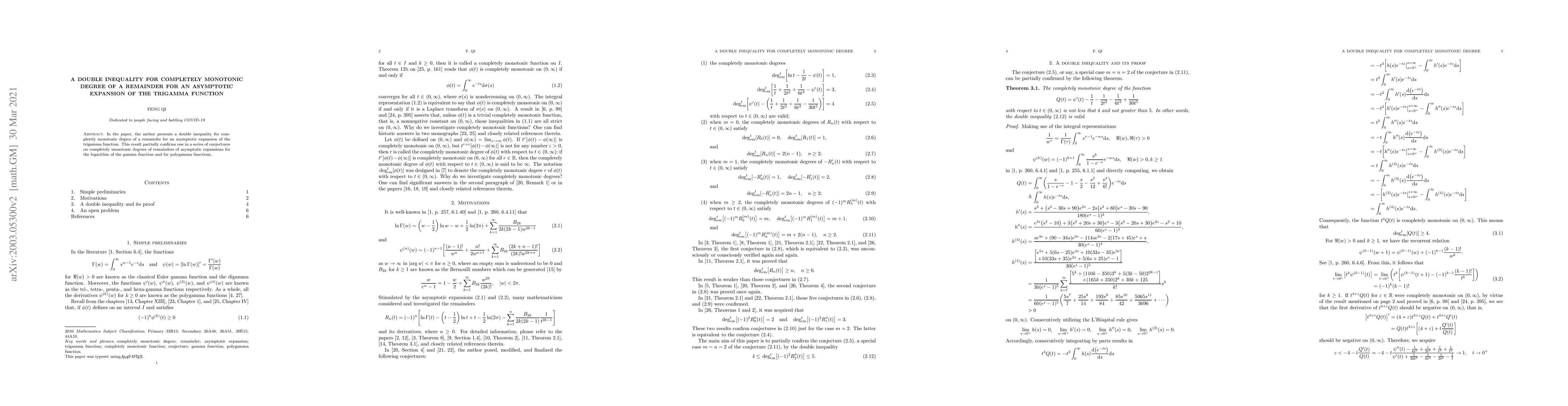 The paper establishes a double inequality for the completely monotonic degree of the remainder in the asymptotic expansion of the trigamma function, partially confirming related conjectures on the logarithmic gamma function and polygamma functions.