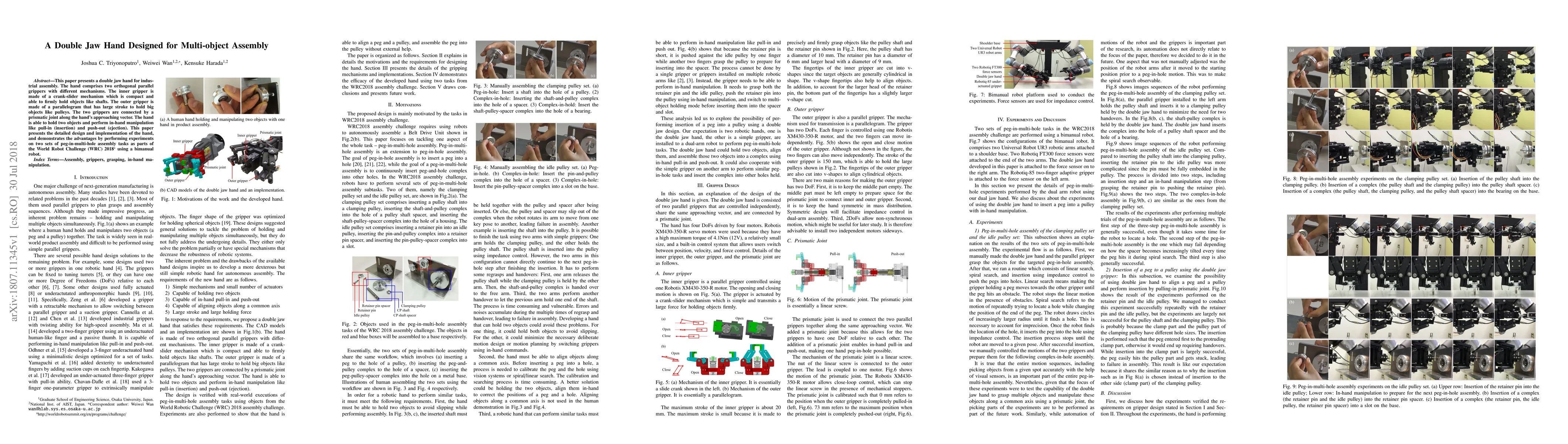 This paper presents a double jaw hand for industrial assembly. The hand comprises two orthogonal parallel grippers with different mechanisms. The inner gripper is made of a crank-slider mechanism which is compact and able to firmly hold objects like shafts. The outer gripper is made of a parallelogram that has large stroke to hold big objects like pulleys. The two grippers are connected by a prismatic joint along the hand's approaching vector. The hand is able to hold two objects and perform in-hand manipulation like pull-in (insertion) and push-out (ejection). This paper presents the detailed design and implementation of the hand, and demonstrates the advantages by performing experiments on two sets of peg-in-multi-hole assembly tasks as parts of the World Robot Challenge (WRC) 2018 using a bimanual robot.