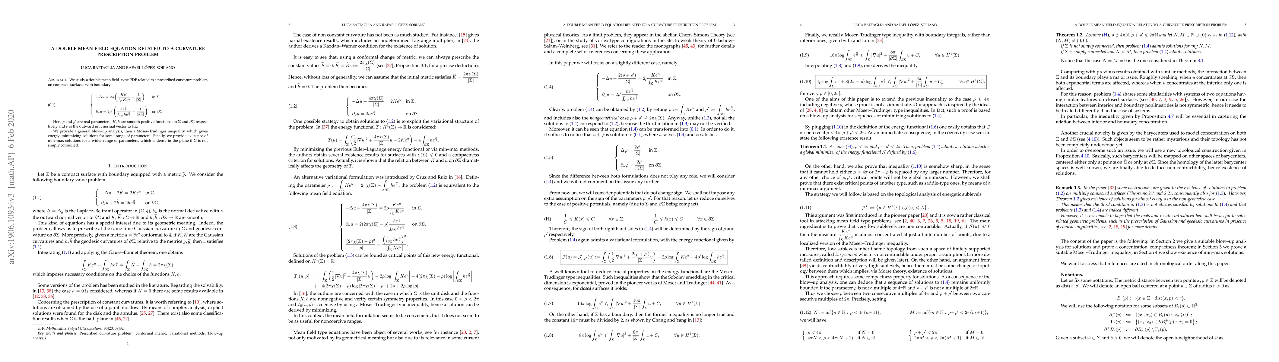 We study a double mean field-type PDE related to a prescribed curvature problem on compacts surfaces with boundary. We provide a general blow-up analysis, then a Moser-Trudinger inequality, which gives energy-minimizing solutions for some range of parameters. Finally, we provide existence of min-max solutions for a wider range of parameters, which is dense in the plane if $\S$ is not simply connected.