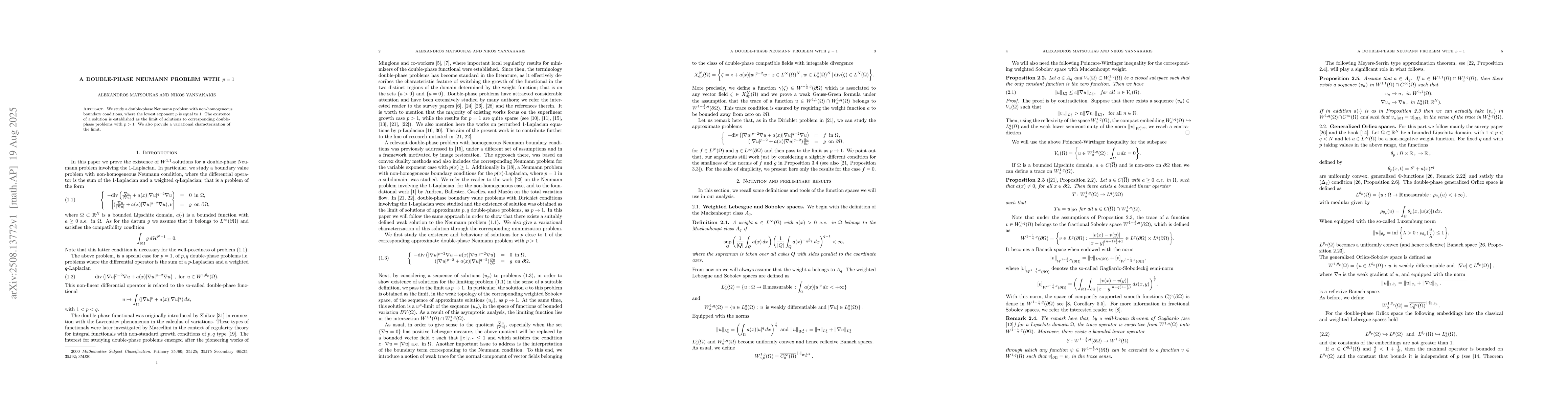 We study a double-phase Neumann problem with non-homogeneous boundary conditions, where the lowest exponent $p$ is equal to 1. The existence of a solution is established as the limit of solutions to corresponding double-phase problems with $p>1$. We also provide a variational characterization of the limit.