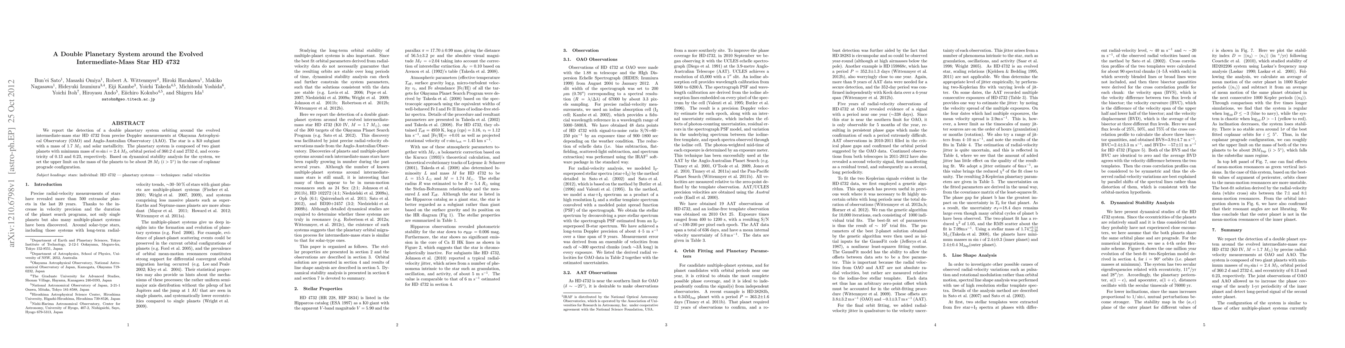 Precise Doppler measurements were conducted at Okayama Astrophysical Observatory (OAO) and Anglo-Australian Observatory (AAO) to detect a double planetary system around the evolved intermediate-mass star HD 4732.
