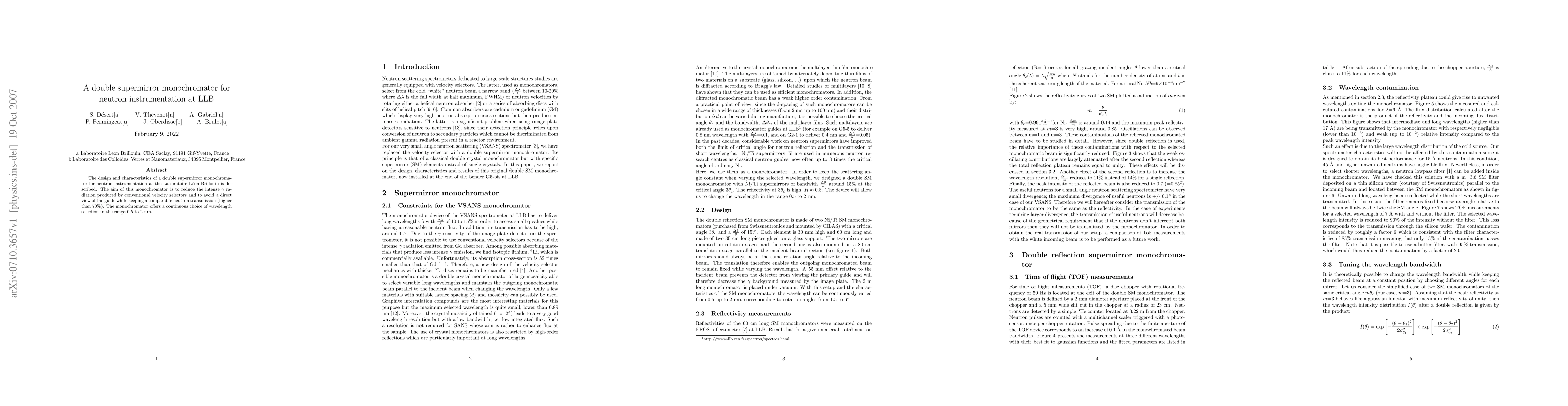 The paper describes the design of a double supermirror monochromator for neutron instrumentation at LLB, aiming to reduce gamma-radiation and maintain high neutron transmission while offering continuous wavelength selection from 0.5 to 2 nm.