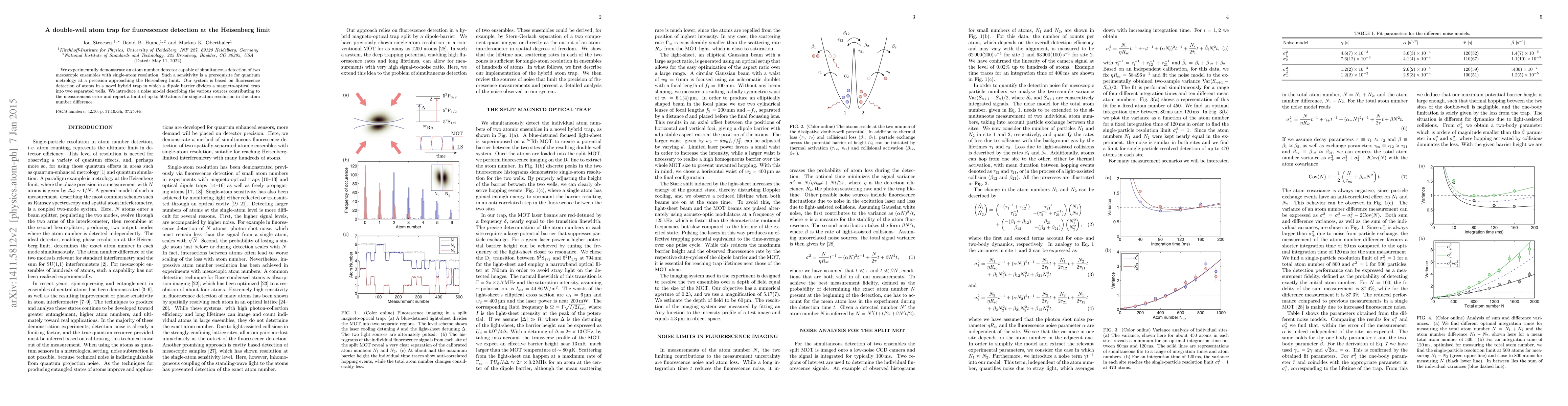 This research demonstrates a double-well atom trap using fluorescence detection for quantum metrology, achieving single-atom resolution and approaching the Heisenberg limit. The system divides a magneto-optical trap into two wells with a dipole barrier, enabling simultaneous detection of mesoscopic atom ensembles and a measurement error model.