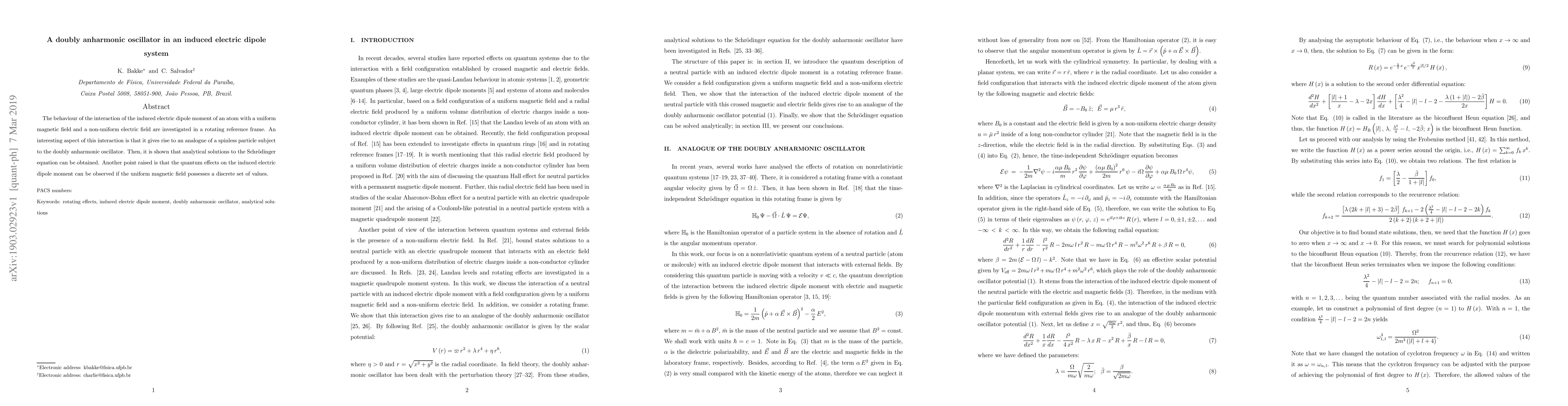 The behaviour of the interaction of the induced electric dipole moment of an atom with a uniform magnetic field and a non-uniform electric field are investigated in a rotating reference frame. An interesting aspect of this interaction is that it gives rise to an analogue of a spinless particle subject to the doubly anharmonic oscillator. Then, it is shown that analytical solutions to the Schr\"odinger equation can be obtained. Another point raised is that the quantum effects on the induced electric dipole moment can be observed if the uniform magnetic field possesses a discrete set of values.