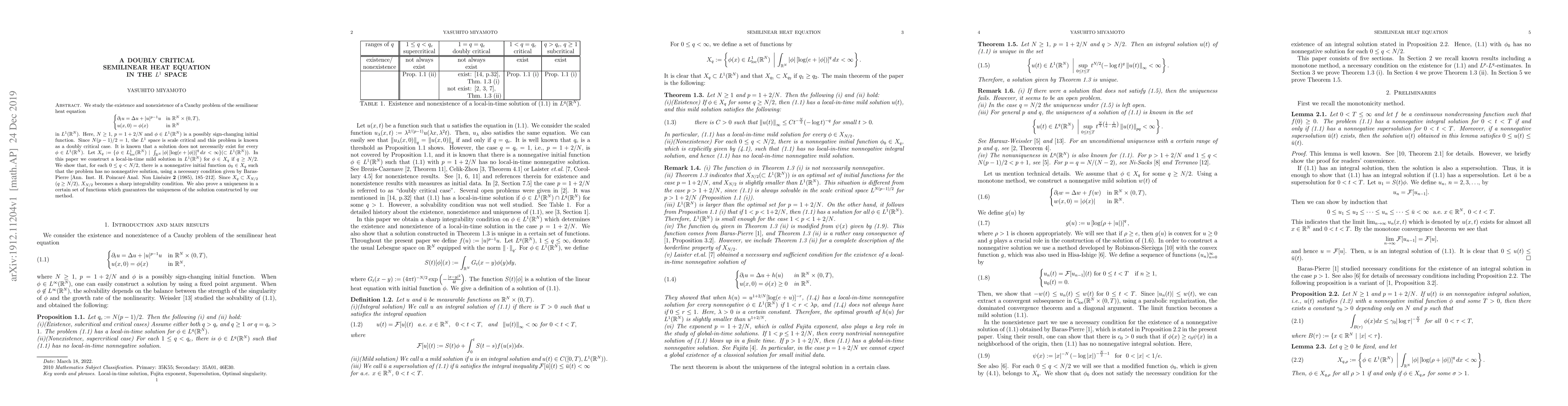 This paper investigates the existence and nonexistence of solutions to a semilinear heat equation in the $L^1$ space, focusing on a doubly critical case where $N(p-1)/2=1$. A local-in-time mild solution is constructed for certain initial functions, while others have no nonnegative solutions.